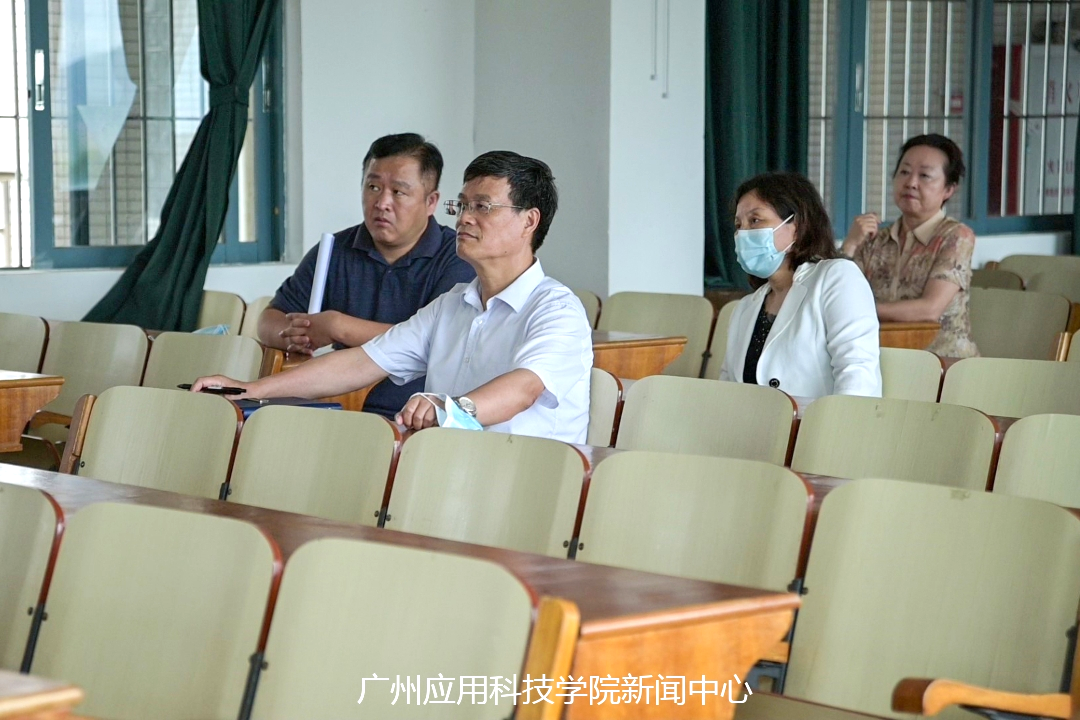 ▲学校董事长、校长刘剑锋(前排)在副校长刘志新(右二)等的陪同下,在广州校区现场督导聆听毕业生毕业答辩。