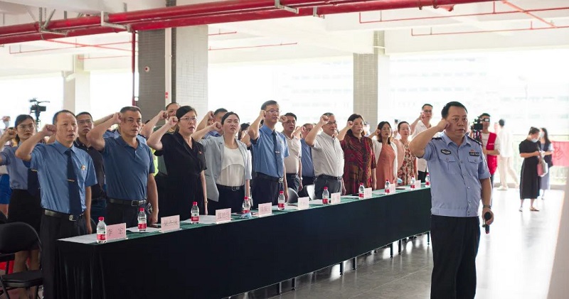 宣讲结束后,鼎湖区副区长、公安分局党委书记、局长高成,区人民检察院检察长唐祝亮,莲花镇委书记陈振玉,区委政法委常务副书记梁杰成,区司法局局长张艳玲,我校党委书记王永云,副校长刘志新,副校长李荆松,法政学院院长梁玉霞共同上台,为莲花镇大中小学生代表赠书,普及禁毒法律知识。同时,鼎湖区副区长、公安分局党委书记、局长高成带领全体人员进行禁毒宣誓和签名仪式。