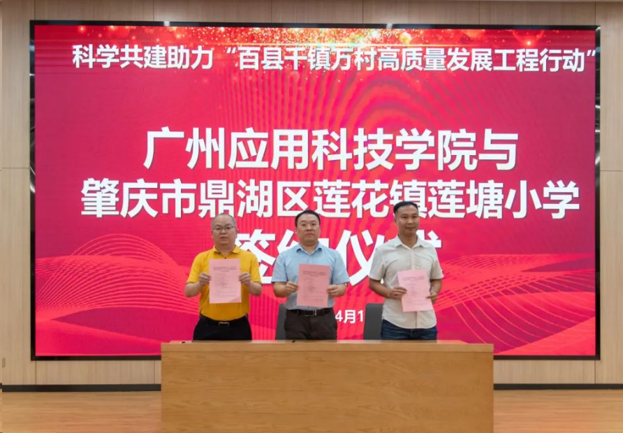 创新创业学院院长、科研处处长荀海鹏代表学校与肇庆市鼎湖区吴大猷学校、肇庆市鼎湖区沙浦初级中学、肇庆市鼎湖区永安初级中学、肇庆市鼎湖区莲花初级中学、肇庆市鼎湖区沙浦中心小学、肇庆市鼎湖区永安中心小学、肇庆市鼎湖区永安新村小学、肇庆市鼎湖区莲花真光中心小学、肇庆市鼎湖区莲花莲塘小学、肇庆新区华侨城小学、鼎湖中学(初中部)共11所中小学签订《新时代中小学科学教育协议书》。