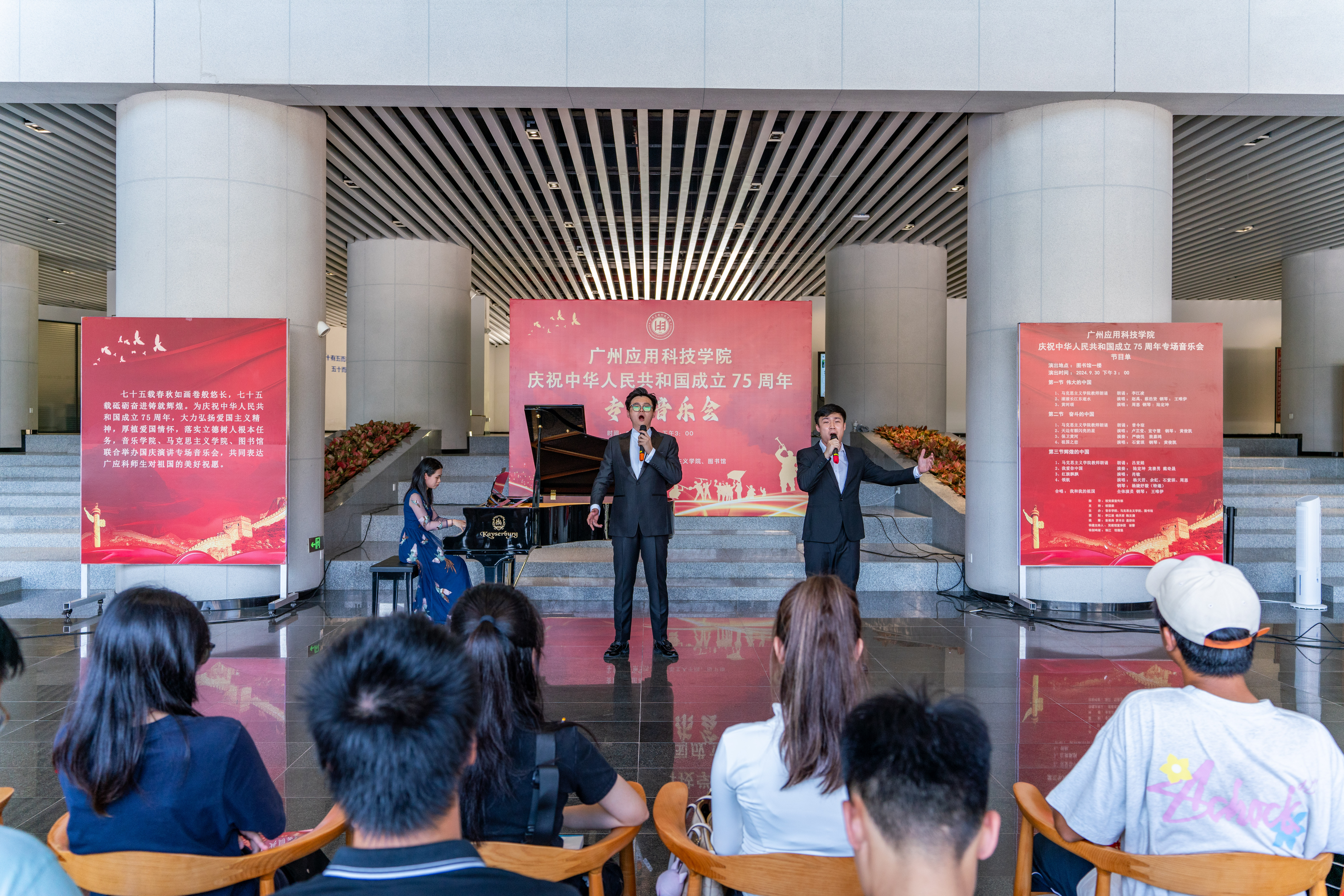 在金秋送爽、举国同庆的美好时节,广州应用科技学院洋溢着一股浓厚的节日氛围。为庆祝中华人民共和国成立75周年,9月30日下午,学校举办国庆专场音乐会,以音乐为媒介,向祖国献上最诚挚的祝福。