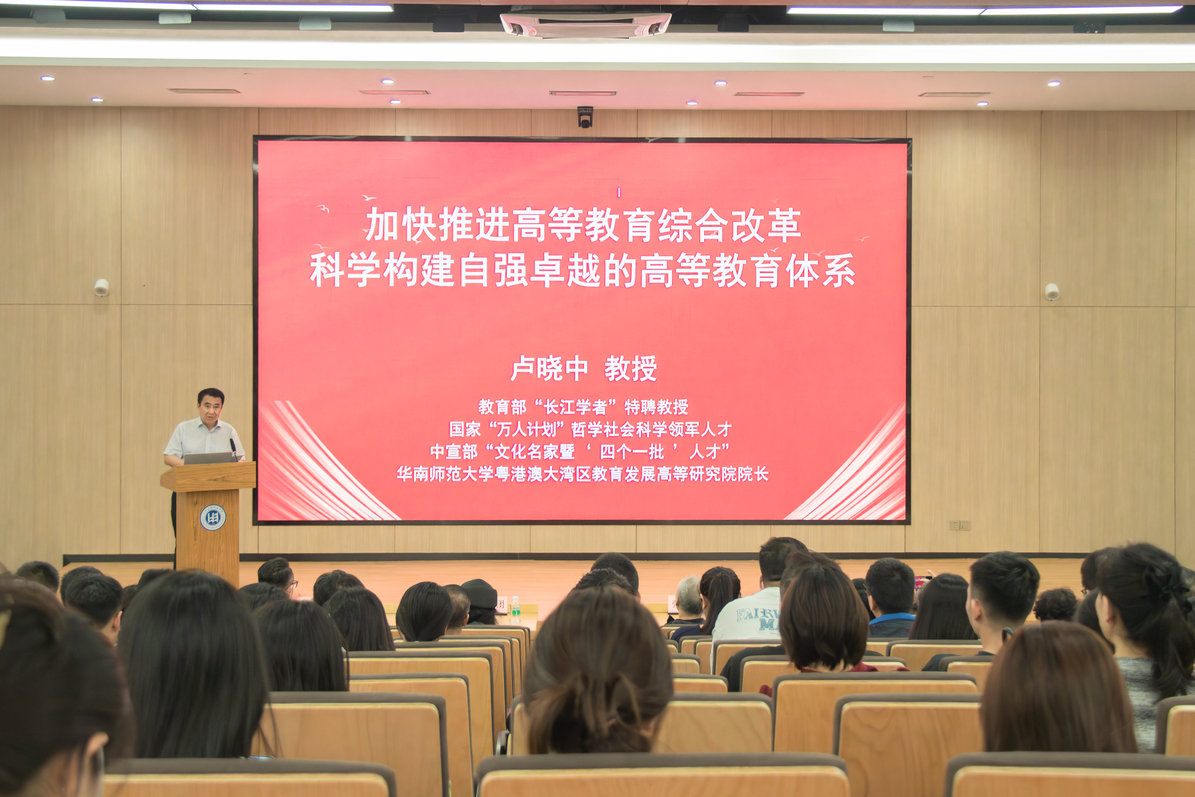 为深入贯彻落实《教育强国建设规划纲要(2024-2035 年)》,进一步提升学校教育发展水平,3月28日,广州应用科技学院鼎新大讲坛第四讲暨青年干部成长营第一营第六期培训在肇庆校区图书馆一楼报告厅举行。教育部“长江学者”特聘教授、国家“万人计划”哲学社会科学领军人才、中宣部“文化名家暨‘四个一批’人才”、华南师范大学粤港澳大湾区教育发展高等研究院院长卢晓中教授受邀作《加快推进高等教育综合改革,科学构建自强卓越的高等教育体系》专题报告。讲坛由学校党委书记陈光团主持,校长张光宇、常务副校长吴舸、校长助理吴明生、校长助理李根珍出席讲坛,全体中层干部、科级干部、系主任、党支部书记、辅导员等近300人参加学习。