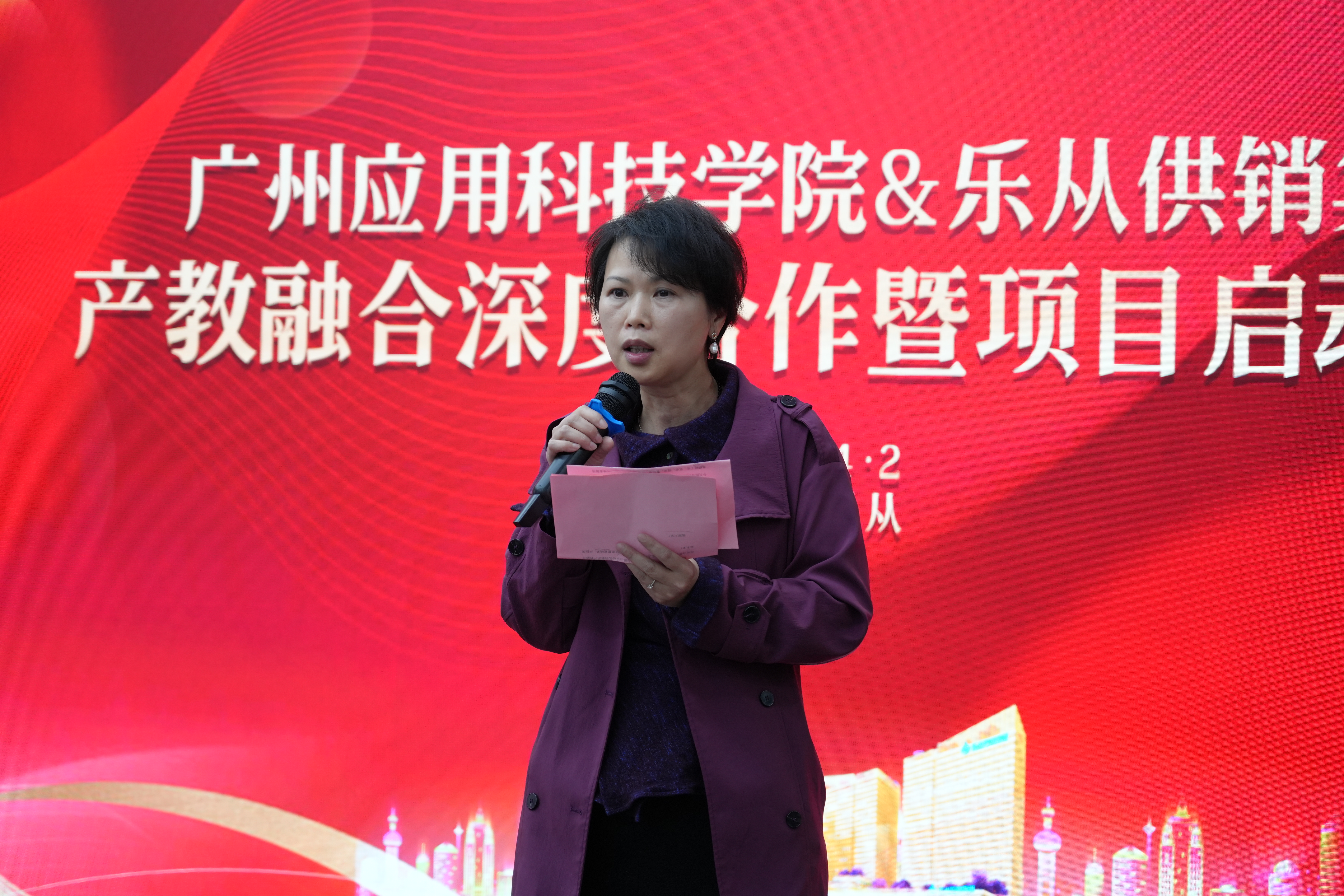 乐从供销集团副董事长劳伟萍在合作签约仪式上讲话,她代表该集团对张光宇校长一行的到来表示热烈欢迎。她表示,乐从供销集团从1951年的一家农村基层供销社发展成为集农业、工业、商业、旅游酒店业、房产物业、投资担保6大行业于一体的集团式企业,经营总额达百亿元,荣获“中国百强民营企业”“广东省大型骨干企业”“广东省农业龙头企业”等荣誉称号。集团旗下现有“猫爪谷景区”“西江酒厂”“荔园饼家”等知名品牌。乐从供销集团期待与广州应用科技学院深化校企合作。集团将为广应科学生提供实训基地、实习岗位和展示平台,双方还将在文旅推广、影视制作、文化IP开发等领域开展深度合作,探索产学研一体化新模式,致力于培养高素质应用型人才,创作具有大湾区特色的文化精品,助力广东高质量发展。