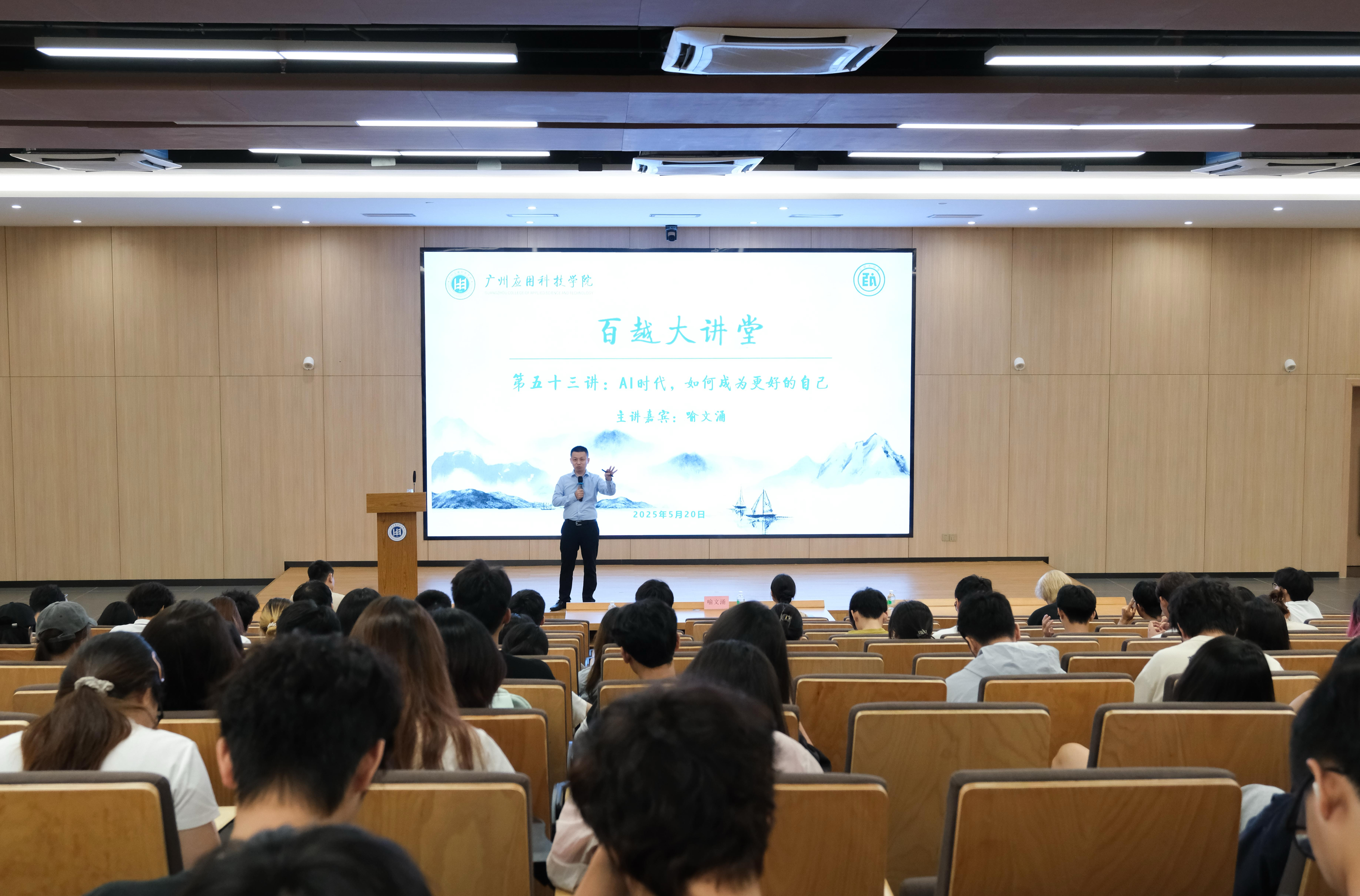 百越大讲堂”第五十三讲于5月20日在图书馆一楼报告厅举行,尊一科技集团总裁喻文涌应邀为我校师生作《AI时代,如何成为更好的自己》专题讲座。校团委书记郭振及300余名师生参加讲座,讲座由郭振主持。
