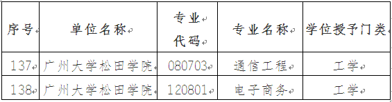 近日,广东省学位委员会公布《广东省学位委员会关于公布2020年新增与撤销学士学位授予专业名单的通知》》(粤学位函〔2020〕3号),依据省学位办对学校专业备案工作的审查情况,广东省学位委员会对我省49所高校166个新增学士学位授予专业基本信息予以确认并备案公布。其中,我校通信工程、电子商务两个专业顺利通过评审,新增为学士学位授予专业(详见列表)。