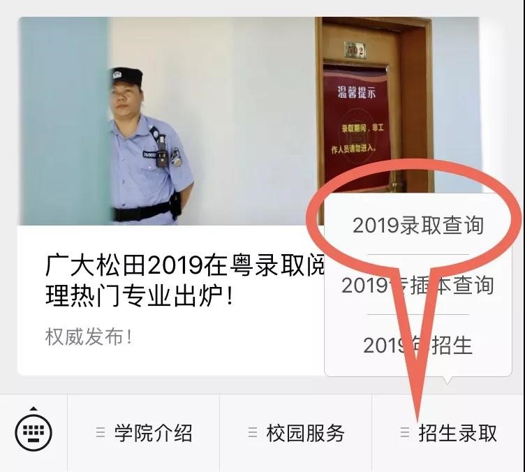 7月19日上午,广州大学松田学院开放2019级新生录取查询系统 ,广东省(普通类、美术类、体育类),浙江省(美术类)录取新生均可登陆我校官微进行查询 。