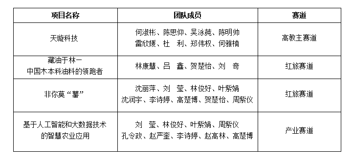 经过二级学院推荐、校赛校外专家评审和训练营选拔,我校共推荐60个项目参加省赛;项目结合我校优势专业,聚焦乡村振兴、区域发展的重点产业,发挥了大学生的青春力量。经过省级复赛、决赛的激烈角逐,学校蝉联“学校集体奖”,《清韵禅茶——仁化白毛茶品牌创新助力乡村全面振兴》《螭吻科技——新能源电池守护者》斩获省赛银奖,《天璇科技》、《藏油于林》、《非你莫“薯”》、《基于人工智能和大数据技术的智慧农业应用》获得省赛铜奖。