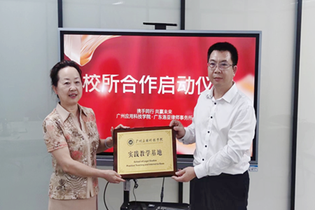 合作启动仪式正式开始,法政学院院长梁玉霞与广东洛亚律师事务所主任黄建球、高级合伙人刘军进行“广应科法政人才协同培养基地”、“实践教学基地”授牌,并为黄建球、张兆明、刘军、梁小凤、邹涛、林鉴波、孙建辉、陈美娟、谭慧仪等12名律师颁发“实践教学导师”聘书。双方希望以此次合作为契机,加强学生理论与实际联系的能力,培养学生的信息整合能力。