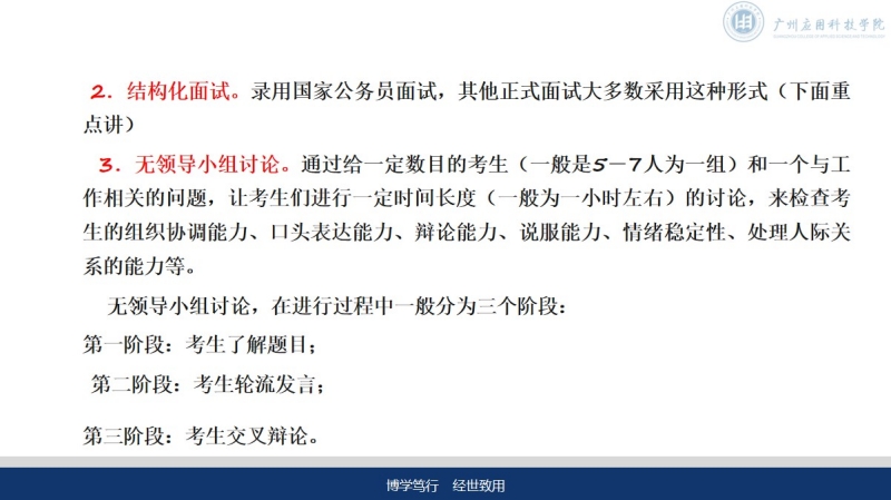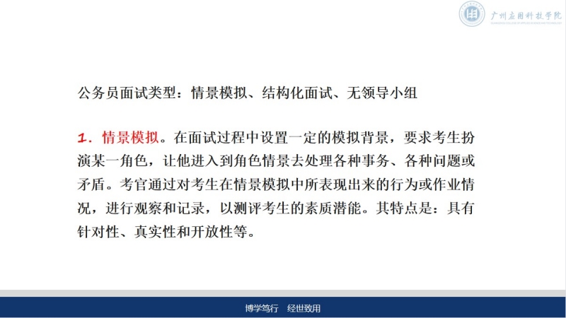 为帮助同学们提前了解公考岗位信息、掌握公务员考试面试技巧、促进同学们综合素质和实战能力的提高、办好公务员结构化面试模拟大赛,广州应用科技学院法政学院行政管理专业于2022年10月13日19:30,在博雅楼S3-501开展了公务员结构化面试预赛培训。本次培训由谢咏欢老师主讲,共97名同学参与本次培训。
