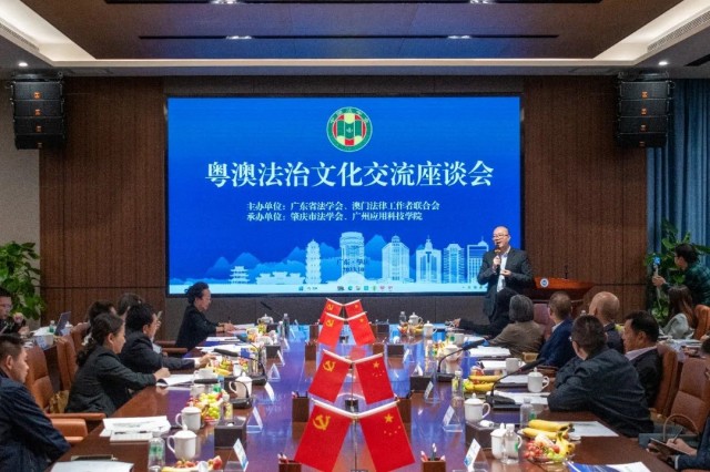10月22日,由广东省法学会、澳门法律工作者联合会主办,肇庆市法学会、广州应用科技学院共同承办的粤澳法治文化交流座谈会,在广州应用科技学院行政中心五楼国际会议中心成功举办。全国人大常委会澳门基本法委员会委员、澳门法联会副理事长兼秘书长王禹,肇庆市副市长、政法委第一副书记、市公安局局长董信奇,广州应用科技学院副校长张光宇,澳门法律工作者联合会会长赵国强,广东省法学会专职副会长兼秘书长金艳,广州应用科技学院法政学院院长梁玉霞出席座谈会并致辞。来自澳门法联会和广东省的部分法律专家、青年学者参加了文化交流会。