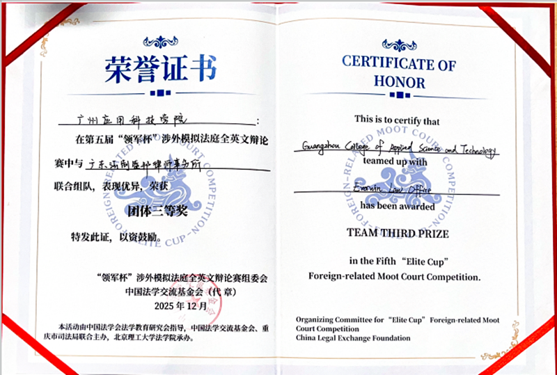此次竞赛是我校首次组队参赛,王伊涵、易慧青、区杰珍三名同学与实务部门人员共同组成五人辩论小组。同学们凭借扎实的专业功底和出色的临场发挥,在与来自中国政法大学、西南政法大学等名校的强劲对手同台竞技时,依然展现出不俗的实力,最终以出色的表现斩获全国三等奖。张洁茹、张荧两位老师分别荣获优秀指导老师,广州应用科技学院荣获优秀组织奖。该成绩的取得,充分展示了我校在涉外法治人才培养方面的强劲实力。