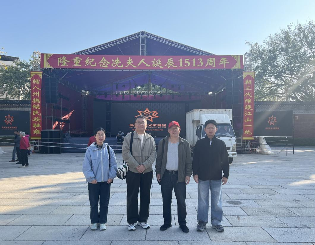 1月11日,调研组出席并观礼“纪念冼夫人诞辰1513周年纪念活动”,对活动组织与仪式流程进行全程观察。活动程序庄重有序,包含奏国歌、各界代表介绍、击鼓仪式、冼太舞表演、宗亲后裔代表致辞、敬献花篮以及研究会会长致辞等环节。调研组重点记录各环节衔接、现场组织动员方式、群众参与特点与文化表达效果,并从公共文化活动的组织运行角度进行分析,为研究冼夫人文化的当代传播形态提供实践依据。