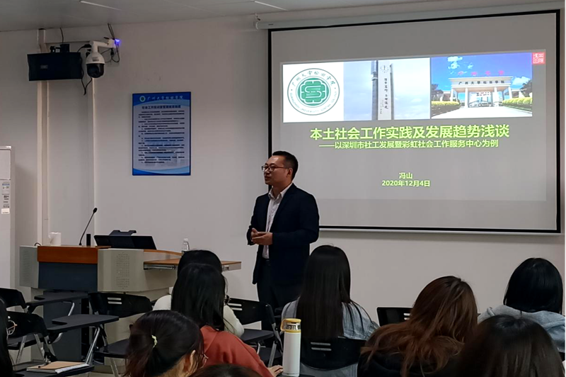 12月4日下午14:30,深圳市龙岗区彩虹社会工作服务中心常务副总干事冯山应邀来我校开展《本土社会工作实践及发展趋势浅谈——以深圳市社工发展暨彩虹社会工作服务中心为例》专题讲座。讲座在我校六栋教学楼301社工实训室举行,参加讲座人员有社会工作教研主任林志聪,以及社会工作专业学生。