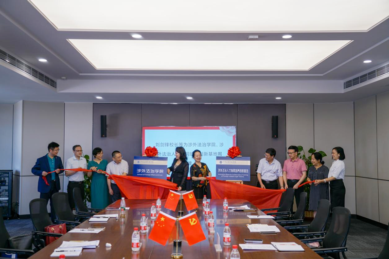 致辞结束后,刘剑锋校长等领导与校外嘉宾一起为涉外法治学院、涉外法治人才协同培养创新基地揭牌,到场人员共同见证了这一重要而美好的时刻。