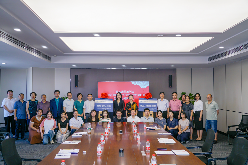 2023年6月29日星期四上午,广州应用科技学院涉外法治学院揭牌仪式在学校行政中心307会议室举行。广州应用科技学院校长刘剑锋、常务副校长吴舸、副校长李江凌、法政学院院长梁玉霞、涉外法治学院院长王文英等领导出席仪式。此外还邀请了几位重量级的教授和实务专家莅临,分别为广东省法学教育研究会副会长兼秘书长、广东法治研究院(涉外法治研究院)副院长、广东外语外贸大学法学院王荣珍教授,广东省网络与电子商务法学会副会长、暨南大学法学院博士生导师郭鹏教授、广东盈隆律师事务所创始合伙人、管委会主任毛德龙博士。与涉外法治学院同时揭牌的还有涉外法治人才协同培养创新基地。揭牌仪式由法政学院涉外法治人才培养实验班负责人邱冬梅老师主持。仪式完毕后,各与会专家共同开展了涉外法治人才培养座谈会。