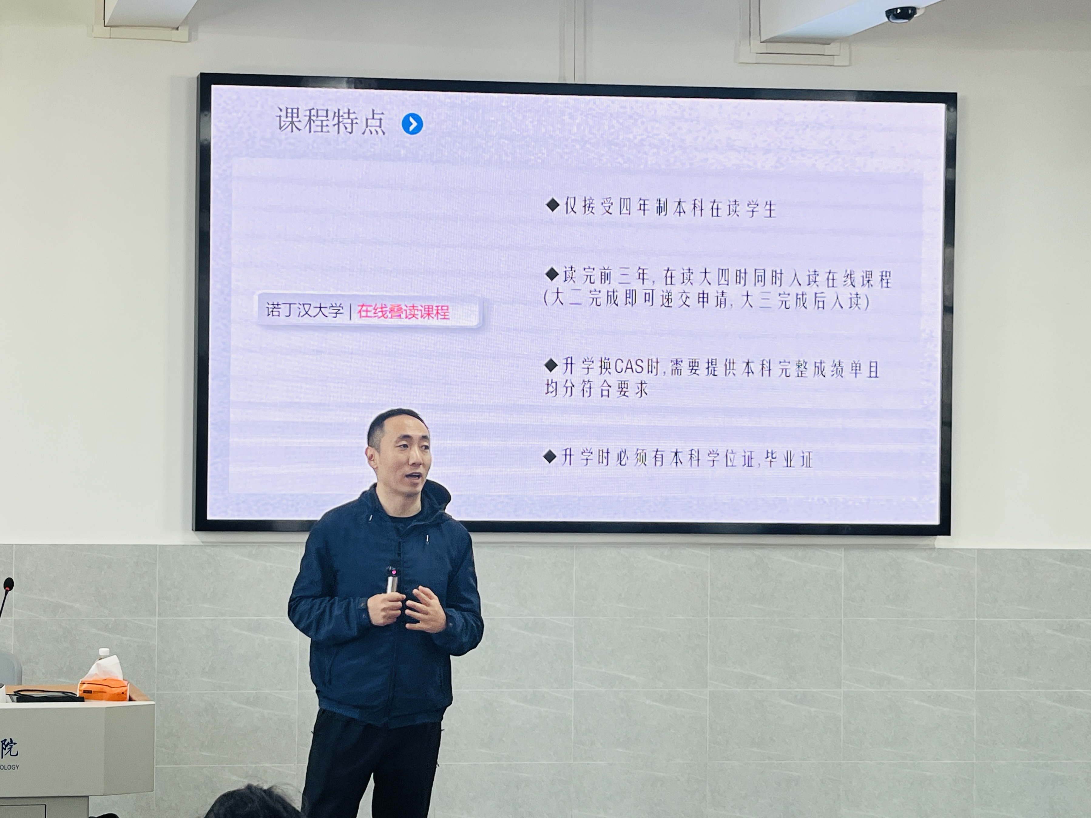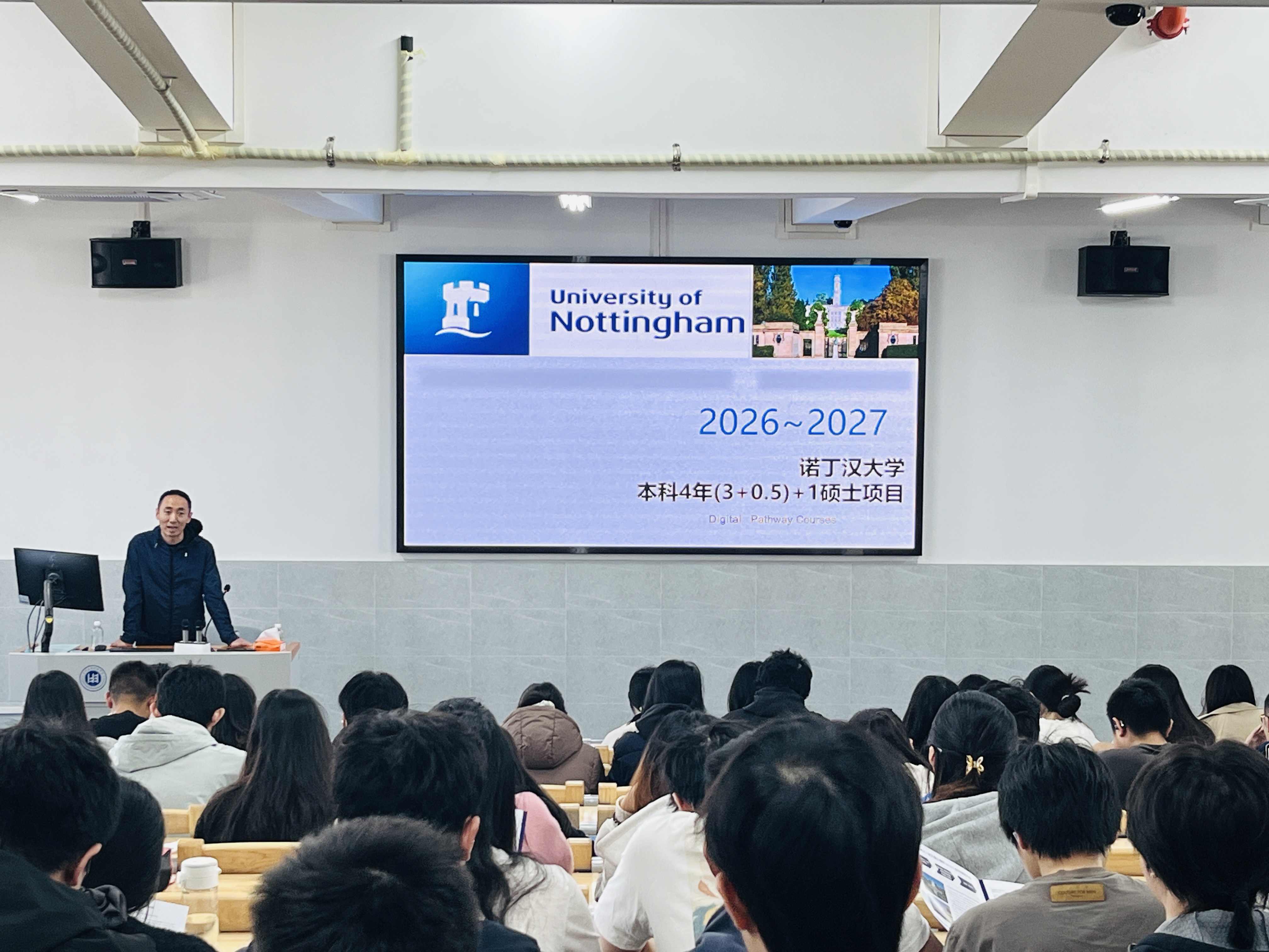 本次宣讲重点推介的“本科4年(3+0.5)+1硕士”叠读项目,是专为四年制本科在读学生量身打造的优质升学方案。该项目采用灵活的学习模式,学生完成本科前三年学业后,可在大四期间同步修读诺丁汉大学在线课程(大二即可递交申请,大三完成后正式入读),本科毕业即可无缝衔接硕士阶段学习,相比传统升学路径节省1年时间。
