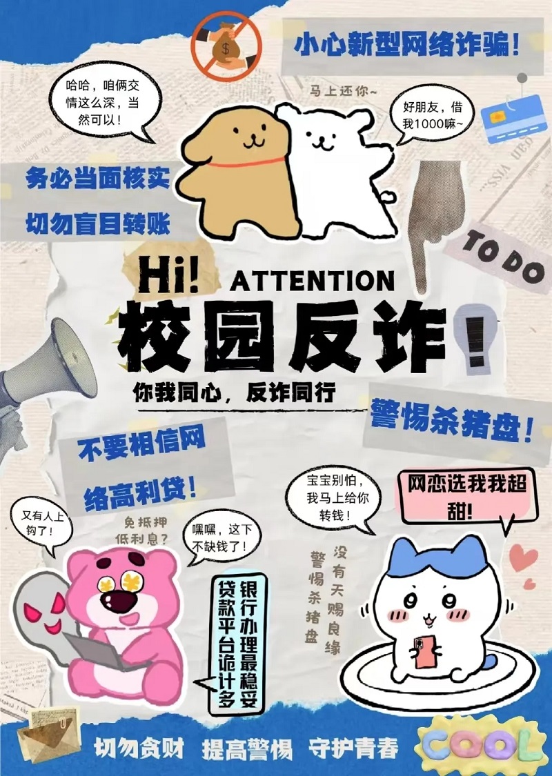 本次活动的参赛作品以反诈防骗为主题,内容可涉及但不限于:电信网络诈骗、校园贷陷阱、兼职刷单骗局等常见诈骗类型。作品应兼具教育性和艺术性,通过创意构思和生动表现,帮助师生直观识别诈骗套路,掌握防范技巧。优秀作品将通过校园官网、宣传栏等平台进行展示推广,请各位同学积极参与哦。