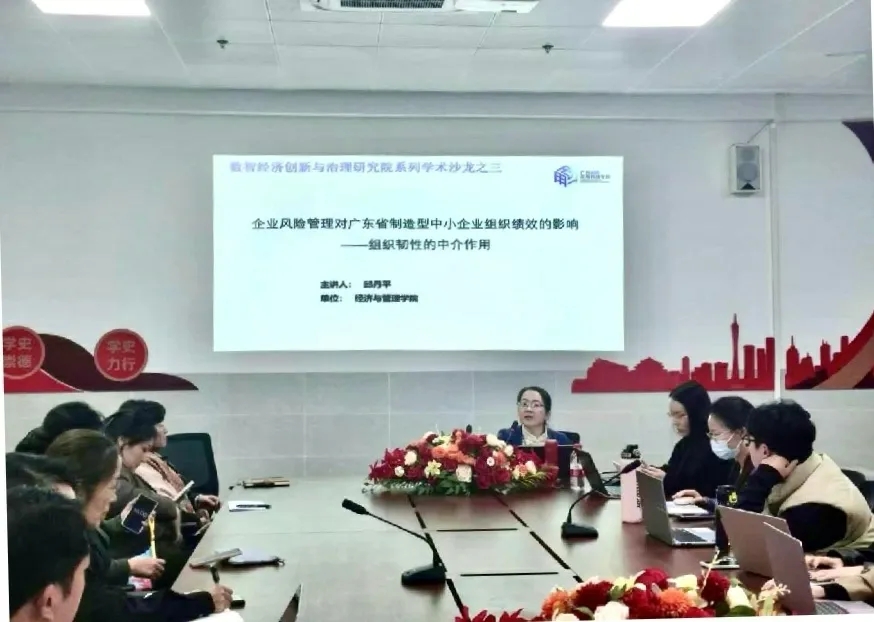 12月16日,第三场学术沙龙讲座以“企业风险管理对广东省制造业中小企业组织绩效的影响”为主题,由邱丹平副教授分享了定量研究方法。邱教授聚焦国家产业链供应链韧性提升的宏观背景,详细拆解了从选题设计、模型构建、数据收集到数据分析的完整研究路径,介绍了 SPSS 26、Smart PLS等软件的应用技巧及问卷设计、样本筛选的实操方法。研讨直面科研瓶颈,现场形成了“发挥定性/定量研究特长”与“构建优势互补团队”等策略,为不同背景的教师提供了因师制宜、优势互补的科研发展思路。
