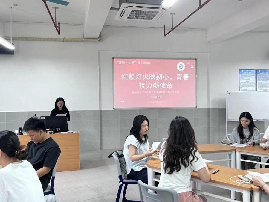 在七一建党节即将来临之际,为深入学习党的二十届三中全会精神、习近平新时代中国特色社会主义思想,持续推进 “学习型” 党组织建设,6月24日下午,经济与管理学院教工党支部与学生第二党支部在博雅楼 S3-703 会议室共同举办了一场主题为 “红船灯火映初心,青春接力砺使命” 的“师说・生语” 第五期读书会暨“微光成炬,向光而行”辅导员工作室微光启航读书分享会。本次活动由教工党支部副书记廖倩文主持,党委书记王世宇书记、陈少芬老师、魏田田老师以及学生第二党支部朱嘉婧书记受邀出席,与师生们共同开启这场意义非凡的精神之旅。