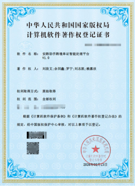 近日,由我院李军老师指导,刘段文、余圳鑫、罗宁、刘志凯、赖嘉欣等同学组成的科研团队,自主研发的《安跨助手跨境单证智能处理平台 V1.0》成功获得国家版权局计算机软件著作权登记证书。这是我院持续深化产教融合的又一重要成果,充分展现了计算机学院学子在智能应用开发与产业需求对接方面的创新实力。