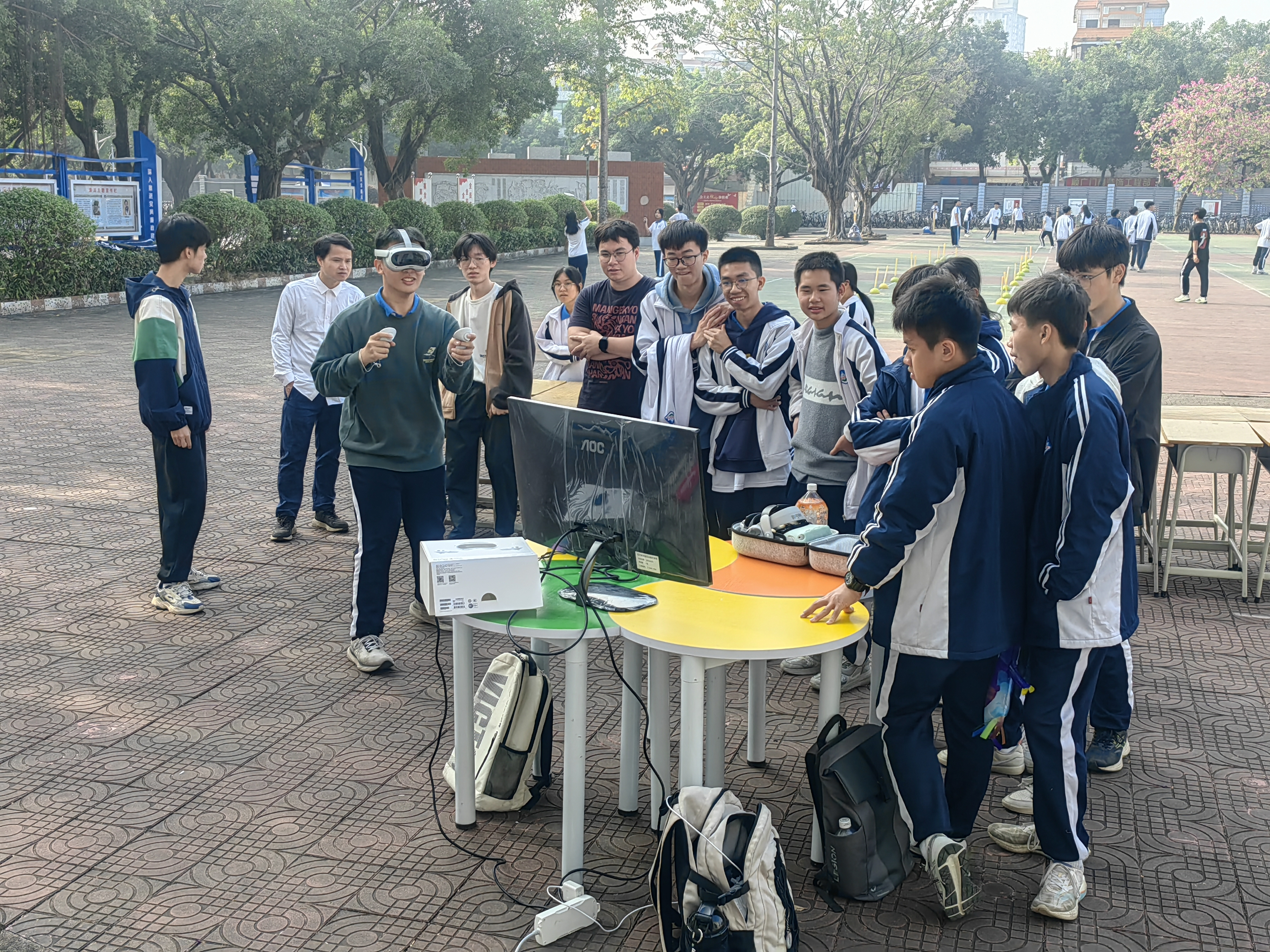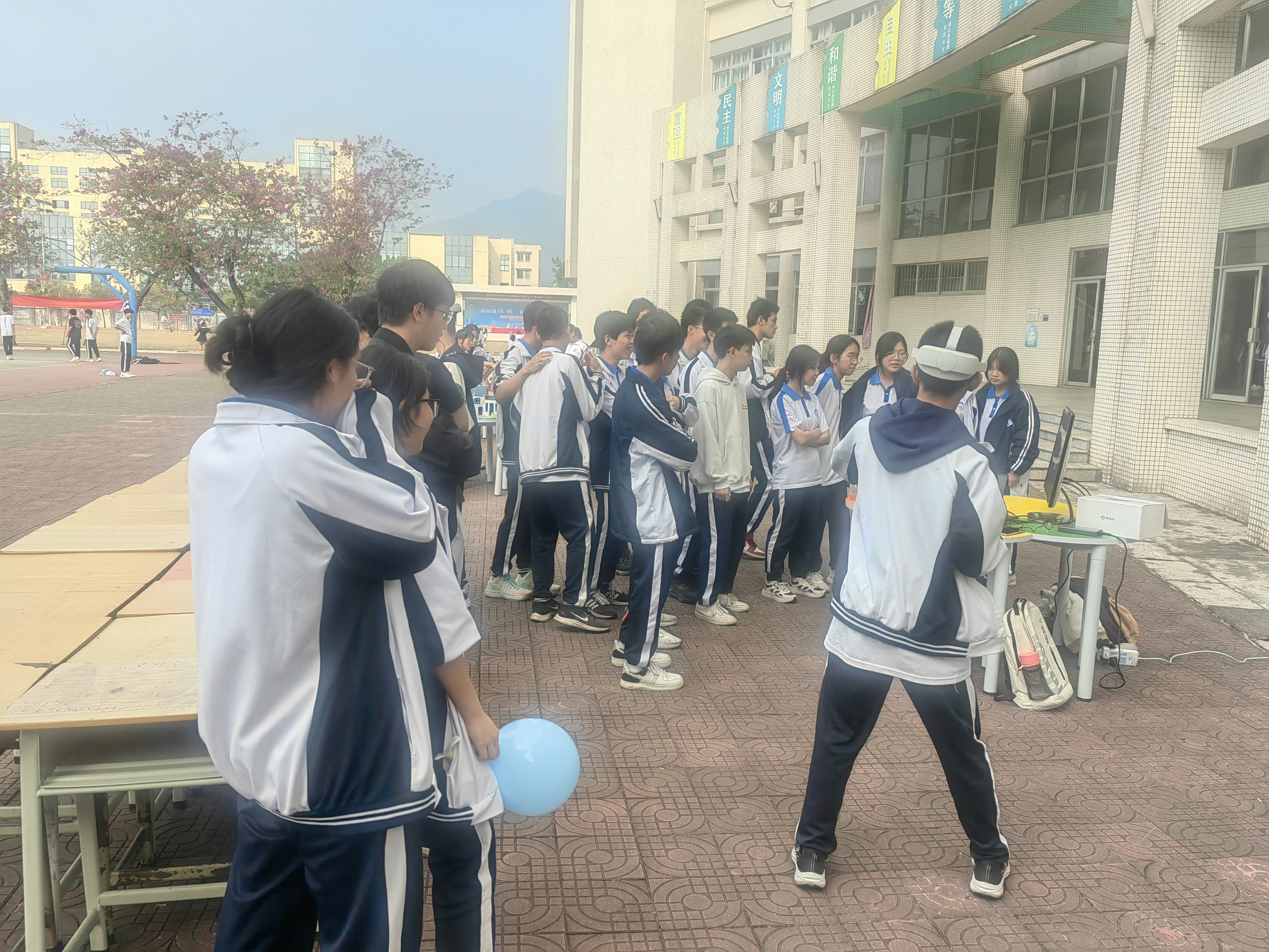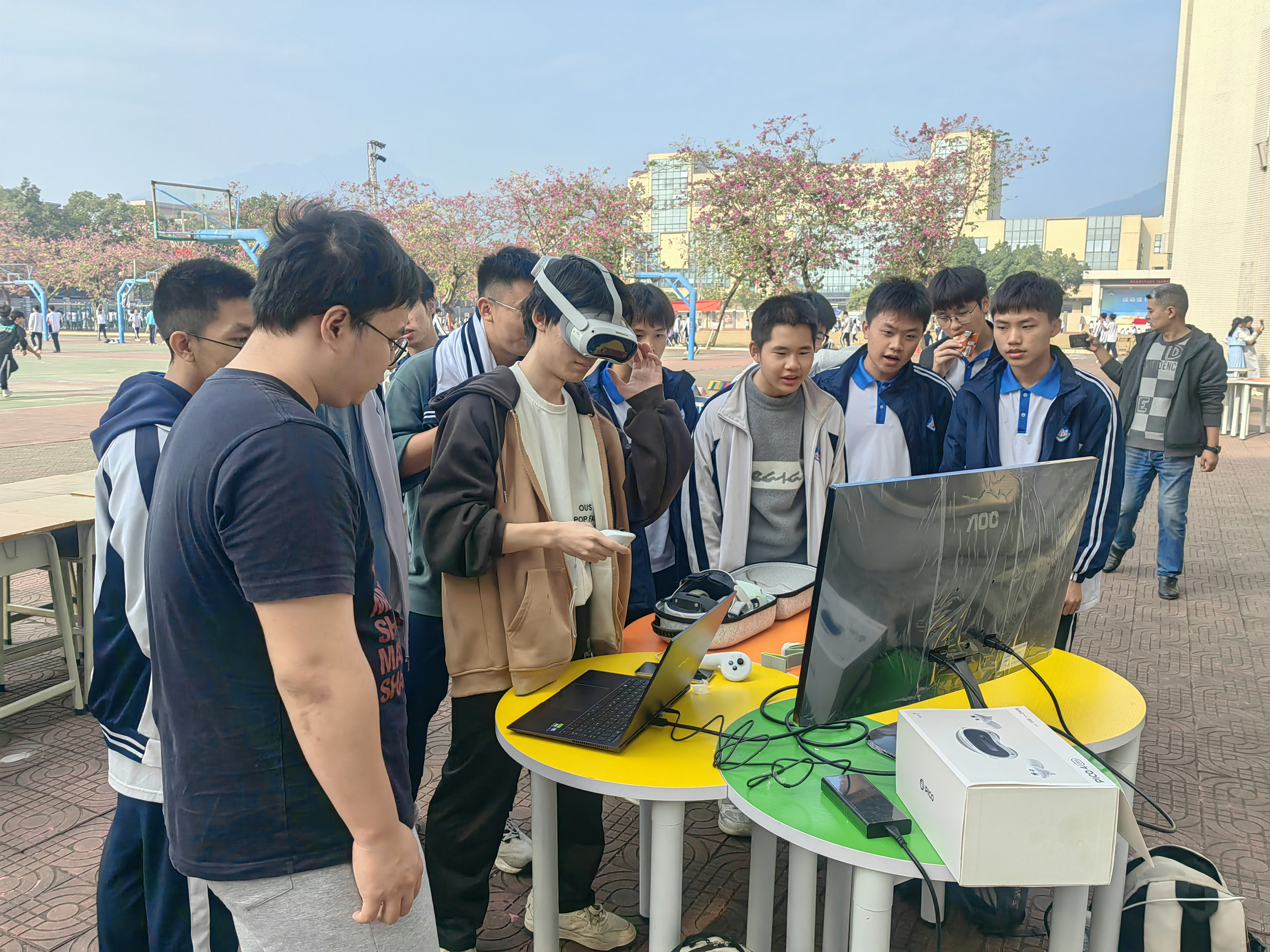 在这个充满活力的冬季,鼎湖中学迎来了一年一度的体育运动会,今年的运动会因科技的璀璨融入而绽放出别样的光彩。广州应用科技学院(广应科)计算机学院与鼎湖中学强强联手,以前沿的VR(虚拟现实)技术为媒介,为校园注入了一股科技活力,为学子们精心打造了一场前所未有的体育科技盛宴,让体育运动以一种焕然一新的姿态展现在众人眼前。此次活动在广应科计算机学院教师(兼鼎湖中学[初中部]科技副校长)任萌老师的带领下,携手2022级软件工程3班的黄秋城同学、李梓桦同学,以及2023级计算机科学与技术6班的张誉龄同学共同参与,他们共同致力于将科技的力量融入体育教育,助力肇庆百千万工程的宏伟蓝图。