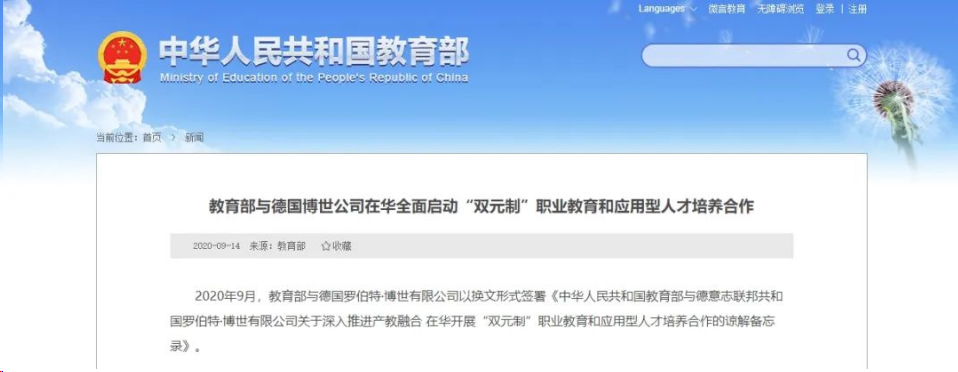 2020年9月,教育部与德国罗伯特·博世有限公司以换文形式,签署《中华人民共和国教育部与德意志联邦共和国罗伯特·博世有限公司关于深入推进产教融合在华开展“双元制”职业教育和应用型人才培养合作的谅解备忘录》。该备忘录是中德双方共同落实关于进一步拓展两国职业教育合作倡议的重要举措。双方将聚焦中国院校和行业需求开展合作,努力把德国企业优质职业教育资源引入中国职业学校和应用型本科院校,提升我国院校在智能制造、车辆工程、信息技术等专业领域的应用型和技术技能型人才培养水平,探索建立符合中国职业教育改革发展、适应现代职业教育体系需要的校企深入合作模式。教育部德国博世应用型和技术技能型人才培养合作试点项目在中国遴选50所符合条件的高水平应用型本科院校、高等职业本科院校或高等职业院校作为试点院校,由博世公司与院校共同开展应用型和技术技能型人才培养国际合作,推动校企合作办学模式和人才培养模式改革。逐步形成产教融合双元育人人才培养新模式,为我国制造业转型升级和高质量发展奠定人才基础。