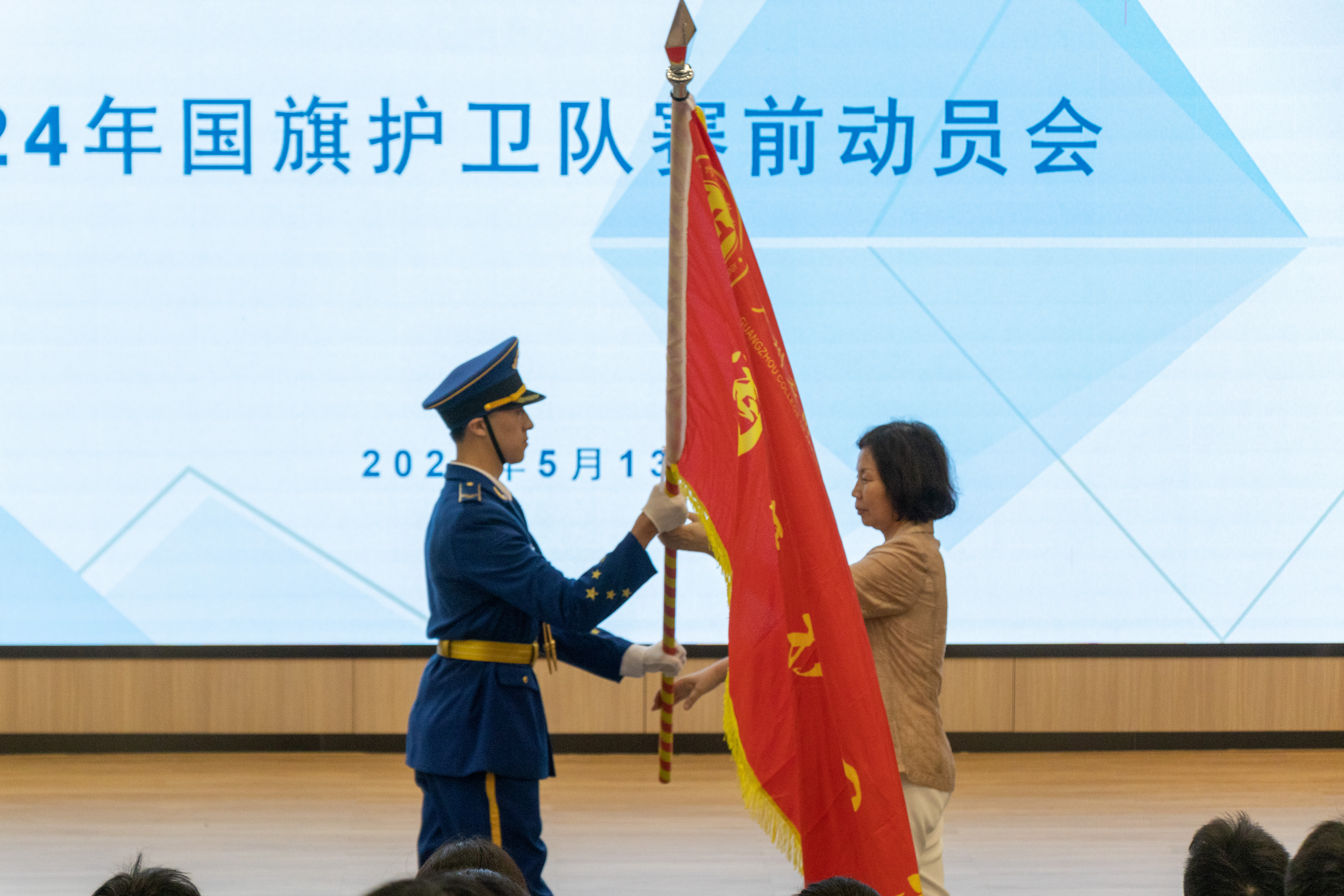 党委副书记刘志新为我校国旗护卫队授旗并作动员讲话。她指出,国旗是国家的象征,是民族的尊严,国旗护卫队是守护这份尊严的重要力量。学校转设更名以来,国旗护卫队队员们以坚定的信念和优良的作风,为学校的国旗护卫工作作出了突出贡献。她希望国旗护卫队队员以天安门国旗护卫队为最高标准,在内心深处烙下爱校、爱党、爱国的印记。她强调,国旗护卫队代表广应科,不仅展现了广应科学子的精神风貌,更是其信仰升华所在。队员们应怀揣对国家的热爱与崇高敬意,积极参与全省大学生国旗护卫队比赛,用一流的标准严格自己,为个人荣誉而战,为学校荣誉而战。