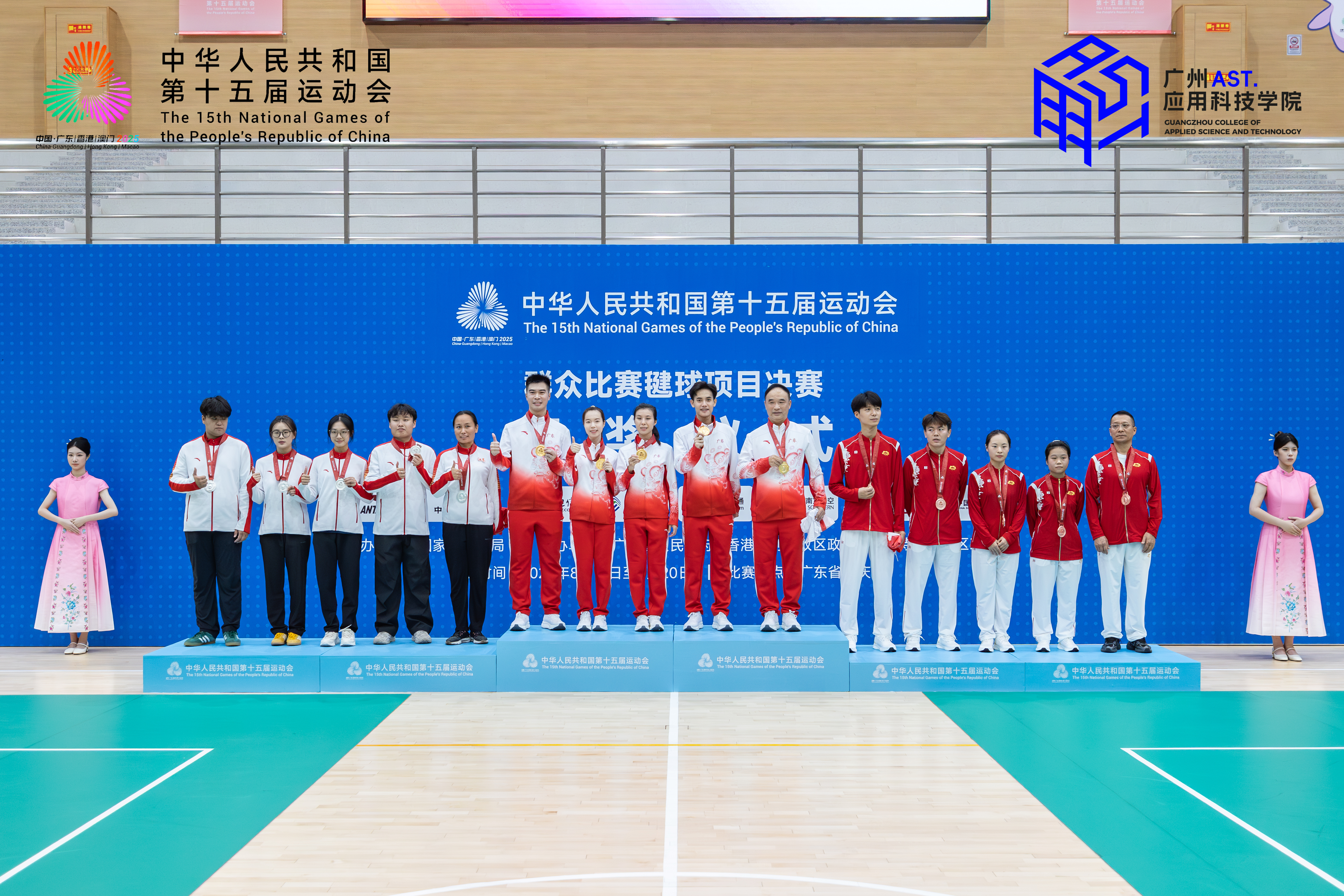 8月17日上午,中华人民共和国第十五届运动会群众比赛毽球项目决赛赛场——广州应用科技学院(肇庆校区)体育馆内,诞生了该项目的首枚金牌。在备受瞩目的4×30秒混合团体接力计数赛决赛中,由陈畑怡(女)、刘叶婷(女)、黎文涛(男)、谢维俊(男)组成的广东代表队发挥出色,以总成绩161次的优异表现技压群雄,不仅勇夺冠军,更刷新了该项目的全国纪录。江苏队、河南队分获亚军和季军。这枚沉甸甸的首金,不仅闪耀于广东队的荣誉簿,也永久镌刻在广州应用科技学院承办全运赛事的史册上。