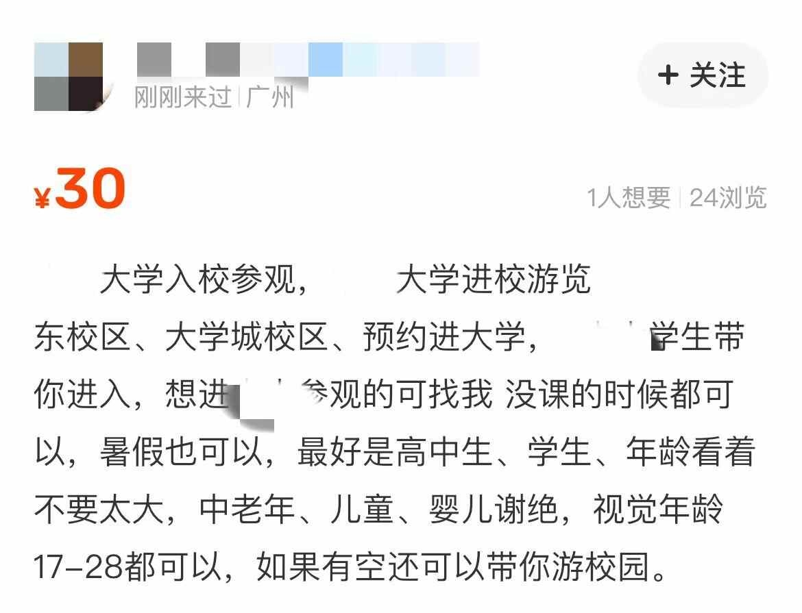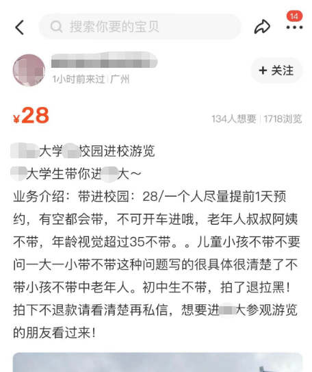 另一名声称是该校学生的卖家则表示:“(收费)28元/人,尽量提前1天预约,有空都会带,不可开车进,年龄视觉超过35岁不带,小孩、中老年人不带。拍下(下单)不退款。”该平台显示,有1718人浏览过该帖子,其中134人想要该服务。