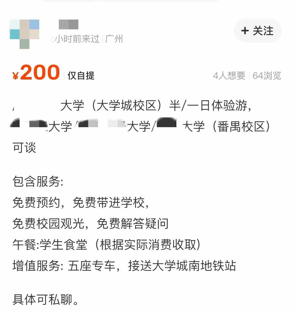 还有卖家告诉记者,自己是学校教职工,可提供该校大学城校区一日游服务。该卖家称,200元可购买半天游,320元全天游。费用包含了带逛校园、全陪讲解、食堂就餐以及专车接送往返大学城南地铁站等。“我建议半天就足够了,一天没必要。”该卖家说道。
