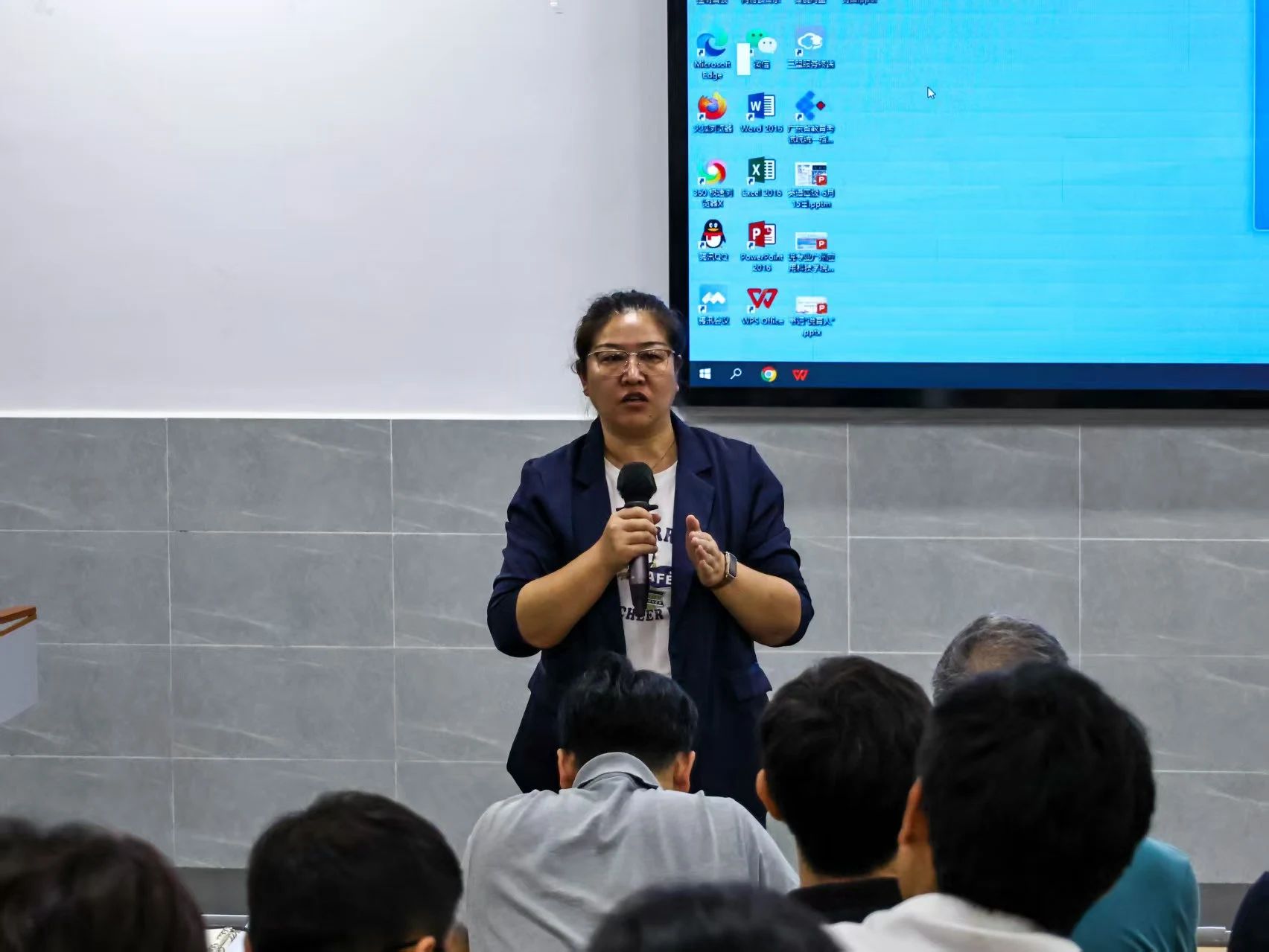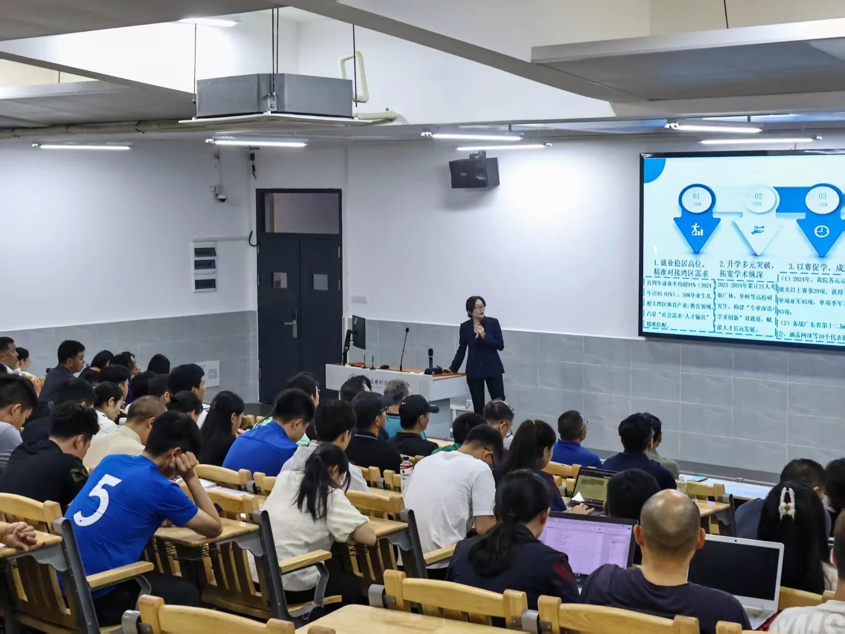 “五说”即院长“说院情”、书记“说育人”、教学副院长“说教学”、专业负责人“说专业”、课程负责人“说大纲”。“说院情”环节,张军院长从五个方面讲述了体科院的情况。介绍学院围绕应用型人才培养,办学特色、定位及对校定位支撑;阐述 OBE 理念于教学各环节落实成效、质量保障体系状况;聚焦师资队伍尤其是青年教师培养;梳理产教融合进程;展现创新创业举措与成效。“说育人”环节,郝淑新书记指出学院党建思政工作的三全育人即全员育人、全过程育人、全方位育人的重要性;讲述建设师德师风与学风、学生指导以及招生就业工作开展的概况。“说教学”环节,王会娟副院长表示,在教育高质量发展的征程中,我院教学管理精耕细作、制度建设迈向规范化;专业与课程建设成果不断进步;严抓教学质量监控与评价,全方位护航教学品质;教学改革研究持续深耕,催生诸多亮眼成果,助力教育创新。社体系主任周敏、休体系主任晏道炯、运康系主任孙红伟、体能系主任谭龙杰,代表体科院的专业参与专业负责人“说专业”评比。随着主持人陈一玮梳理了整场的活动脉络,活动进入了尾声。我们看到专业建设愈发精湛,课程体系日臻完善。每一位师生都是体科院逐梦路上的勇士,一步一个脚印,相信在不久的将来,体育科技学院必将成为应用型体育人才的摇篮,促进学院教育教学质量全面发展提升。