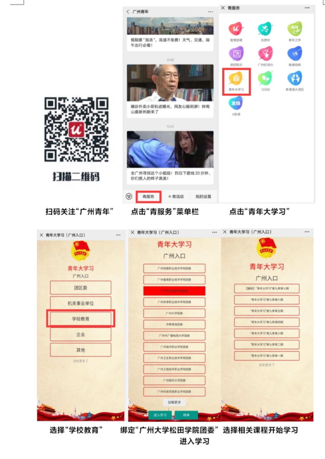 各院系分团委要组织发动本院系全体团员青年,积极关注“广州青年”微信公众号,通过菜单栏【青服务】进入【青年大学习】栏目,在线签到完成“青年大学习”网上主题团课(最新学习指引详见附件)。
