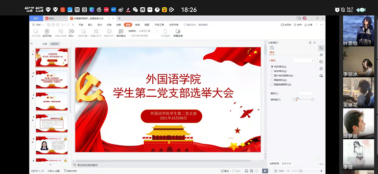 2021年10月9日19:30,外国语学院学生第二党支部组织全体党员在企业微信召开选举大会,会议正式选举党支部委员会成员。