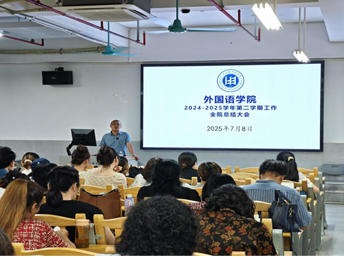 2025年7月8日,外国语学院在明德楼J2-201召开2024-2025学年第二学期工作总结大会。院长邓隽、副院长赖建青出席会议并进行发言,学院全体教职工参会。会议全面总结本学期教学科研与社会服务成果,部署下阶段重点工作,为学院发展注入新动能。