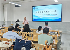 2026年3月31日下午14:30,外国语学院2025-2026学年第二学期第三次全体教职工大会在J2-101教室如期召开。会议由院长助理唐小宁主持,学院领导班子成员及全体教职员工参加了会议,本次大会以聚焦本科教学合格评估,查找问题补短板,奋力整改谋发展为主题,总结前期教学运行情况,系统部署本学期教学材料自查整改、科研教研、毕业论文、实习就业等重点工作。
