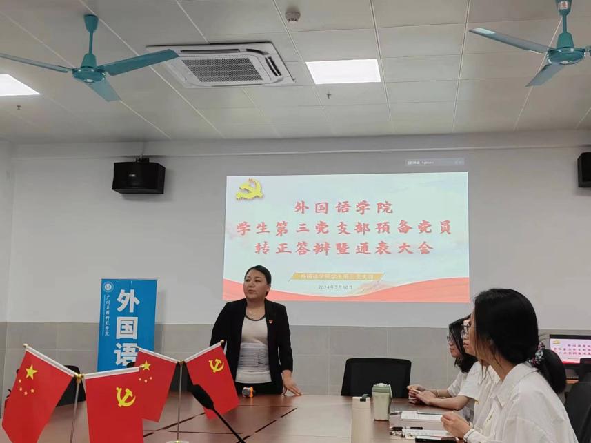 为深入贯彻学习习近平新时代中国特色社会主义思想,不断加强党员党性教育,规范党员发展程序和组织考察体系,增强党支部的凝聚力和战斗力,2024年5月10日19:30,外国语学院学生第三党支部于博雅楼S2-409开展预备党员转正答辩暨通表大会。本次大会参会人员有:外国语学院党委罗月云副书记、外国语学院学生第三党支部韩瑢书记、外国语学院学生第三党支部全体党员同志。