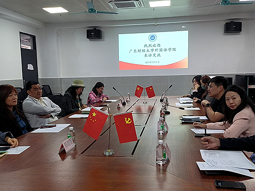 2025年3月21日,广东财经大学外国语学院党委书记谭玉祥率副院长胡红辉、商务英语系主任火敬、日语系主任刘向楠以及学科秘书郑碧莲到我院进行调研,交流研究生培养与就业、师资培养规划及研究生能力需求,学科及专业教学、实践教学,产学研合作等。我校外国语学院党委副书记吴闻、副院长赖建青、英语系副主任谢芳、日语系主任安书慧、办公室主任王雅以及专职组织员颜魁参加此次交流会议。