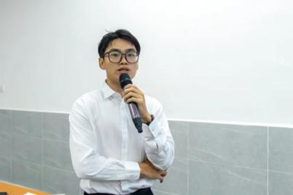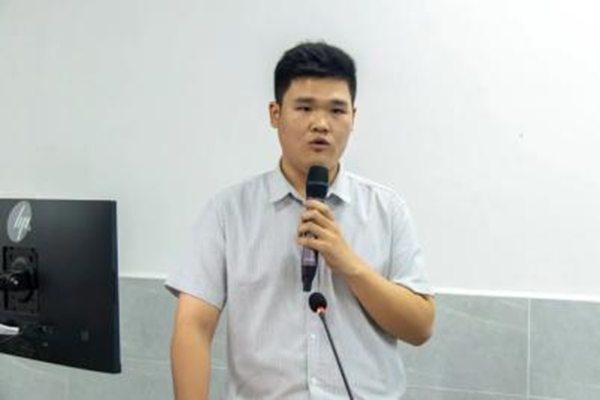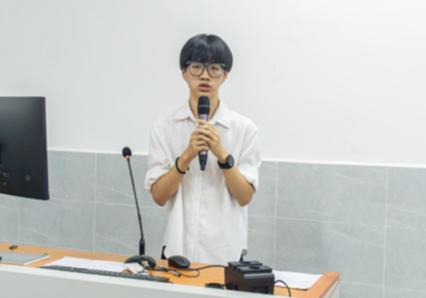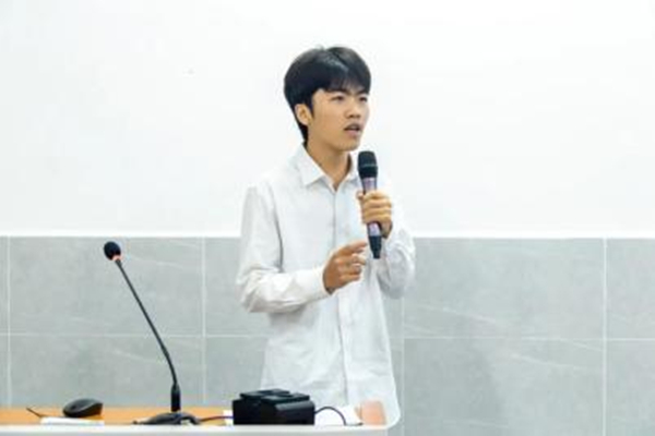 评委对“如何实现理论知识与实践的转化”方面展开提问,他表示在专业课程上要认真学习,积极与老师同学们沟通交流,把知识融入实践,从实践出发解决问题。