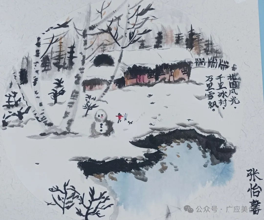 团队成员杨蓓蓓则巧妙地从“中国书法”入手,从“书法文化的起源”讲到“文房四宝”,通过书法练习,学生们更加熟悉汉字的结构、部首和笔画。杨蓓蓓还带领同学们将符合国画意境的诗词,用毛笔字的形式题字到国画作品上,最终完成一副有字有画的国画作品。