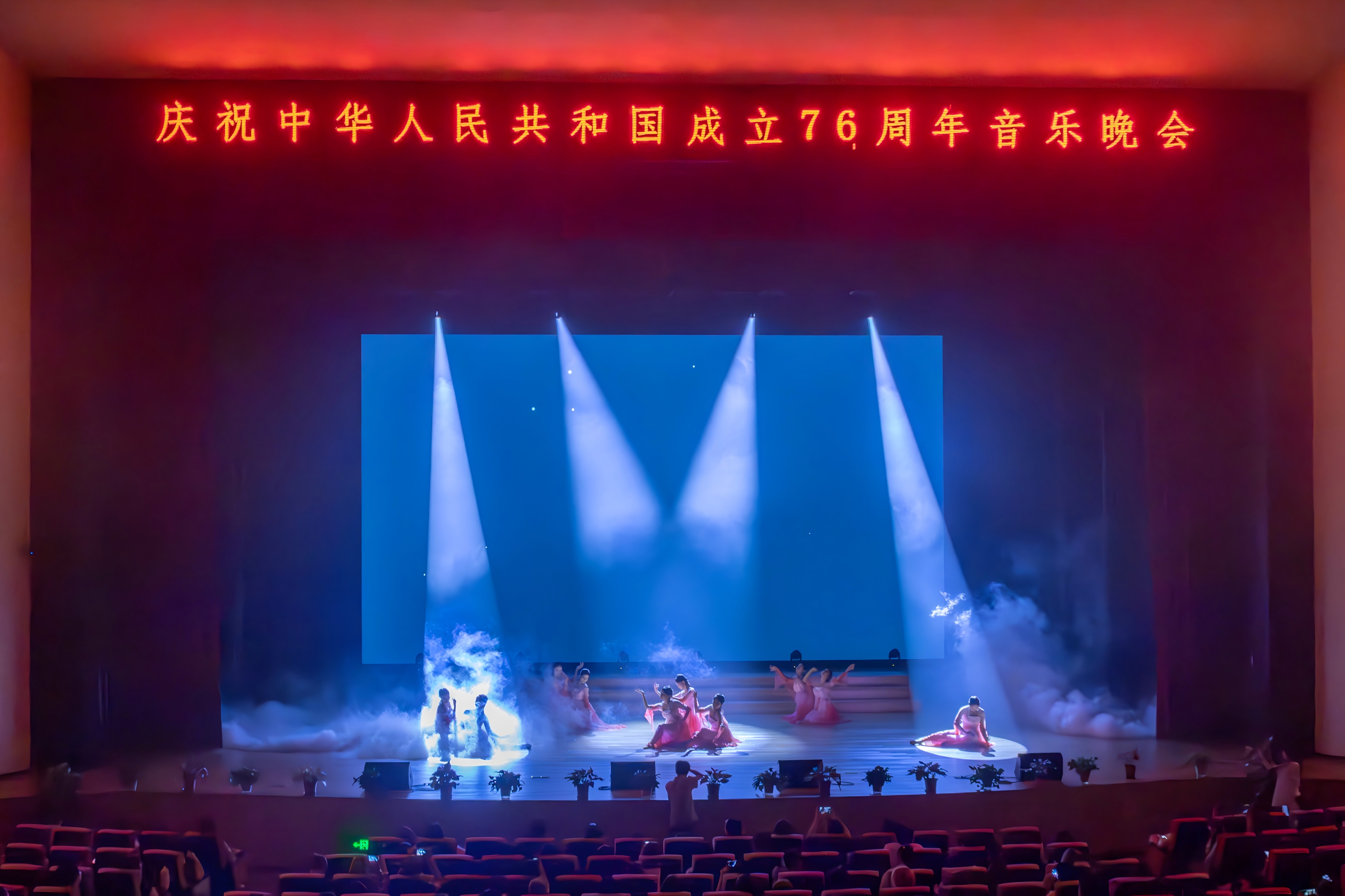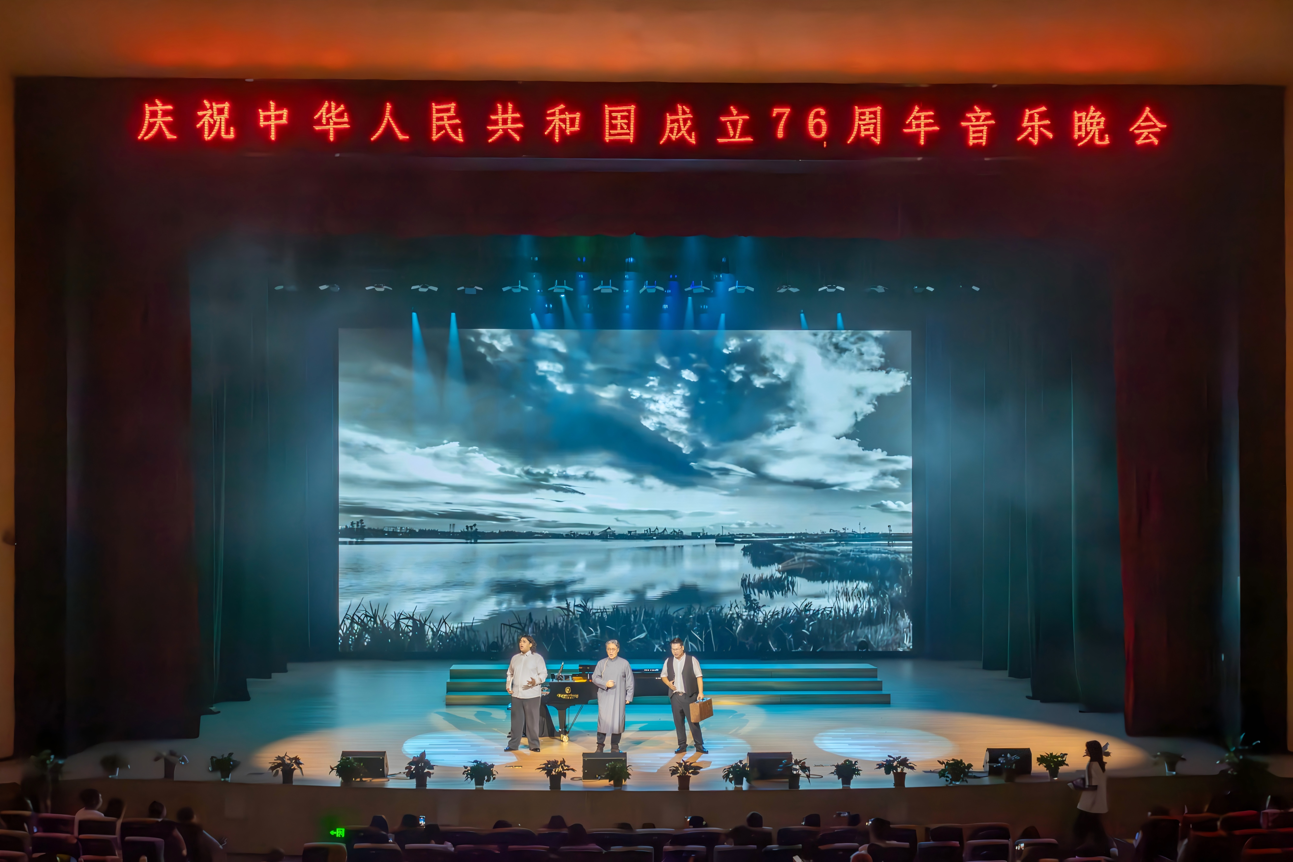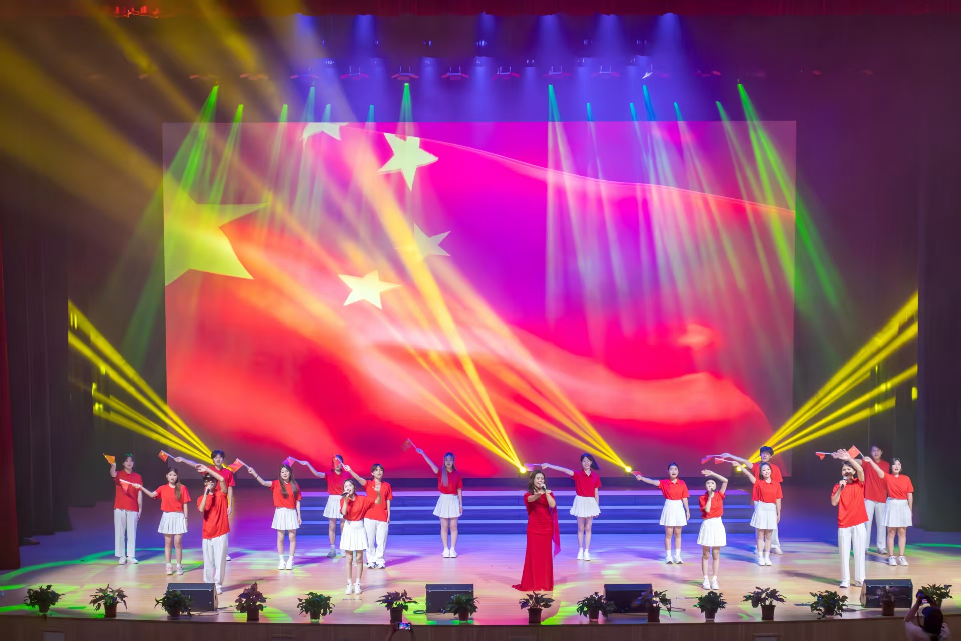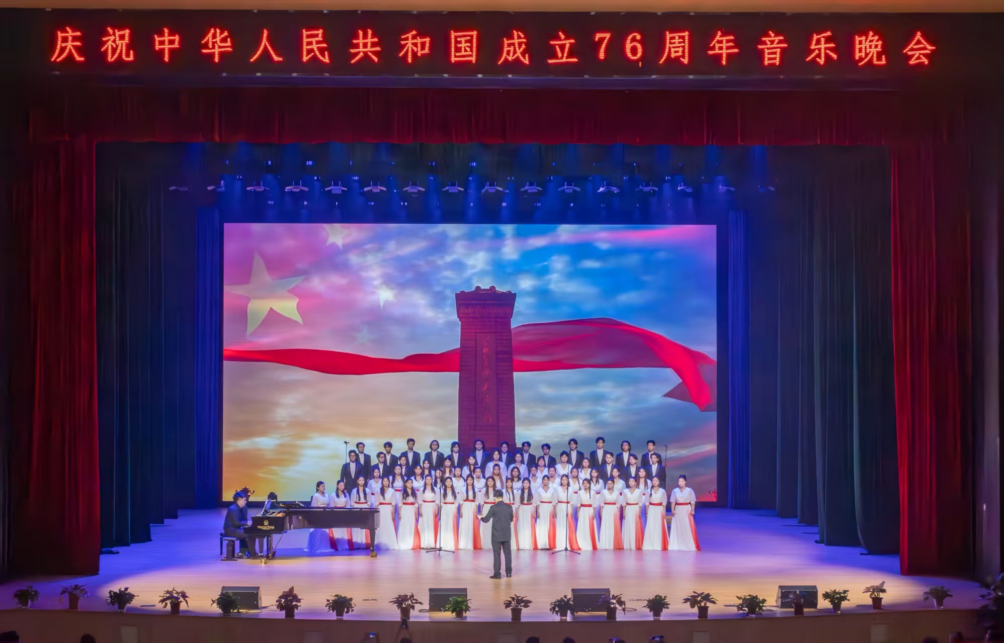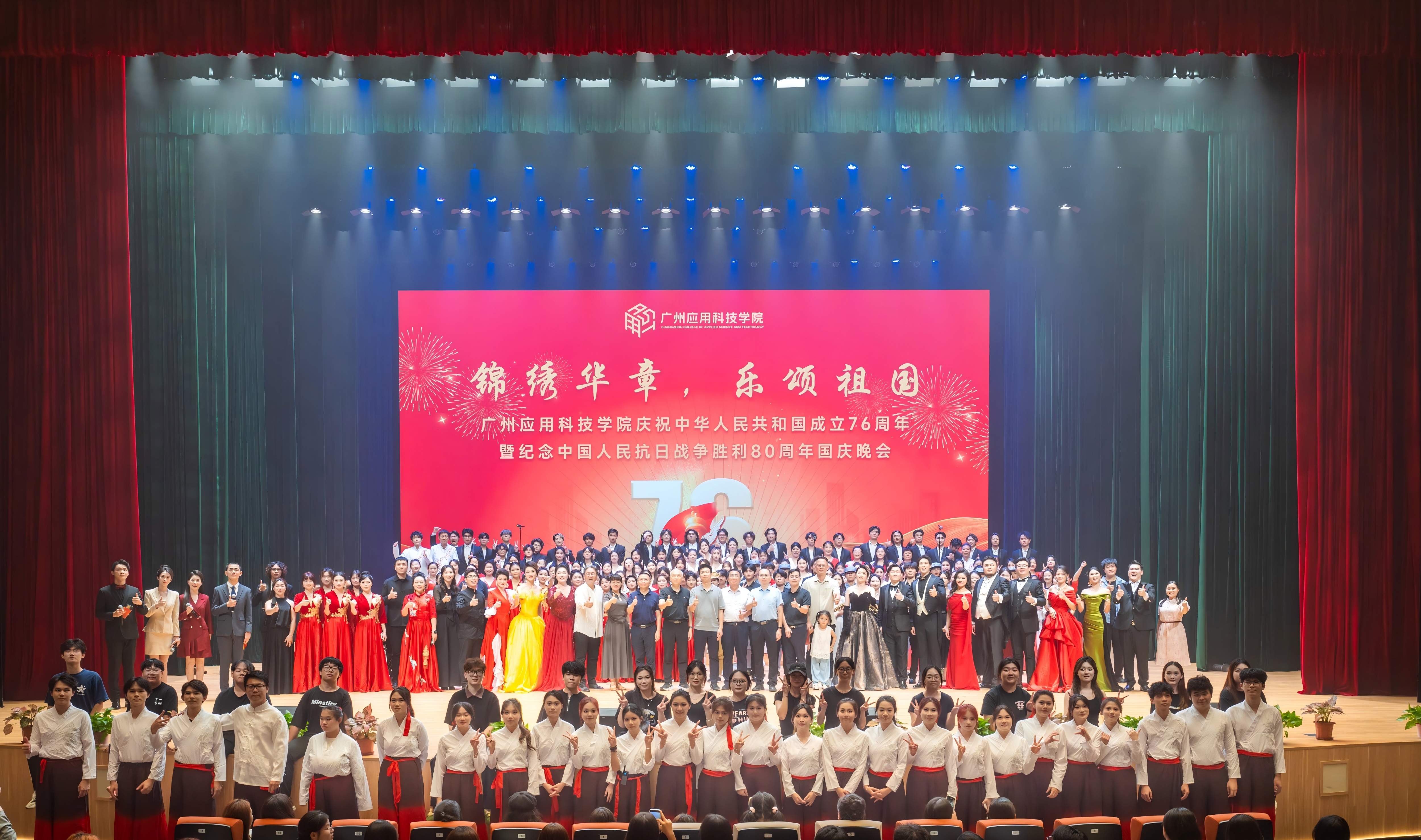 在中华人民共和国成立76周年之际,恰逢中国人民抗日战争胜利80周年的历史节点,2025年9月29日19:30,广州应用科技学院肇庆校区莲花大剧院华灯璀璨、暖意融融,“锦绣华章,乐颂祖国”国庆专场音乐晚会在此隆重奏响。鼎湖区委常委、宣传部部长林坚应邀出席,学校董事长王睿、校长张光宇、党委书记陈光团等董事会及党政校领导班子成员莅临现场,与千余名师生代表欢聚一堂,共赏艺术盛宴,同庆祖国华诞。本场国庆音乐会由学校党委宣传部统筹主办、音乐学院精心承办。晚会用旋律回望峥嵘岁月,用舞姿礼赞盛世华章,生动展现了广应科师生朝气蓬勃、昂扬向上的精神风貌,更以艺术之力诠释了学校“适者大成”的育人理念——在时代浪潮中锚定发展方位,在美育浸润中涵养家国品格,在强国征程中书写广应科担当。