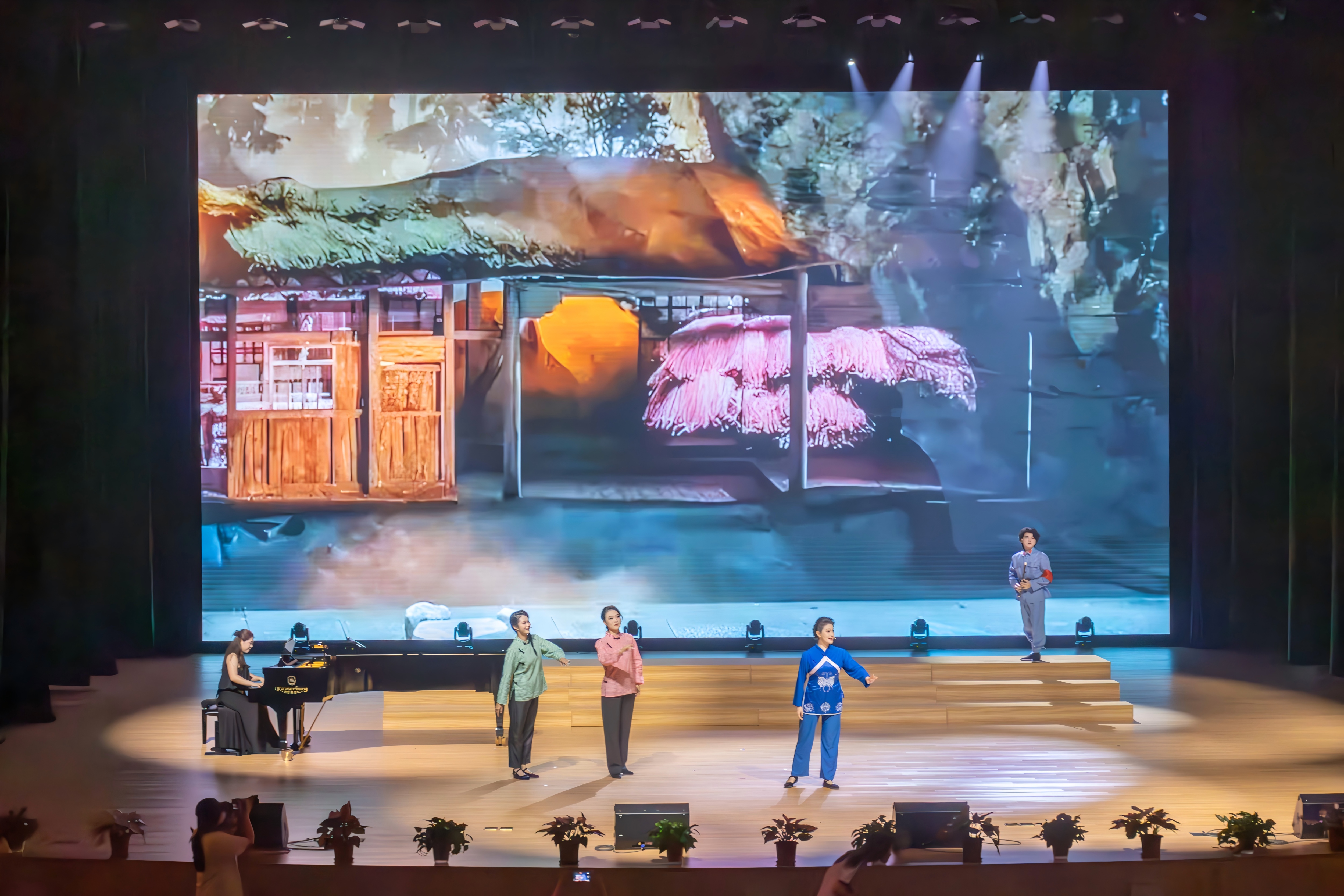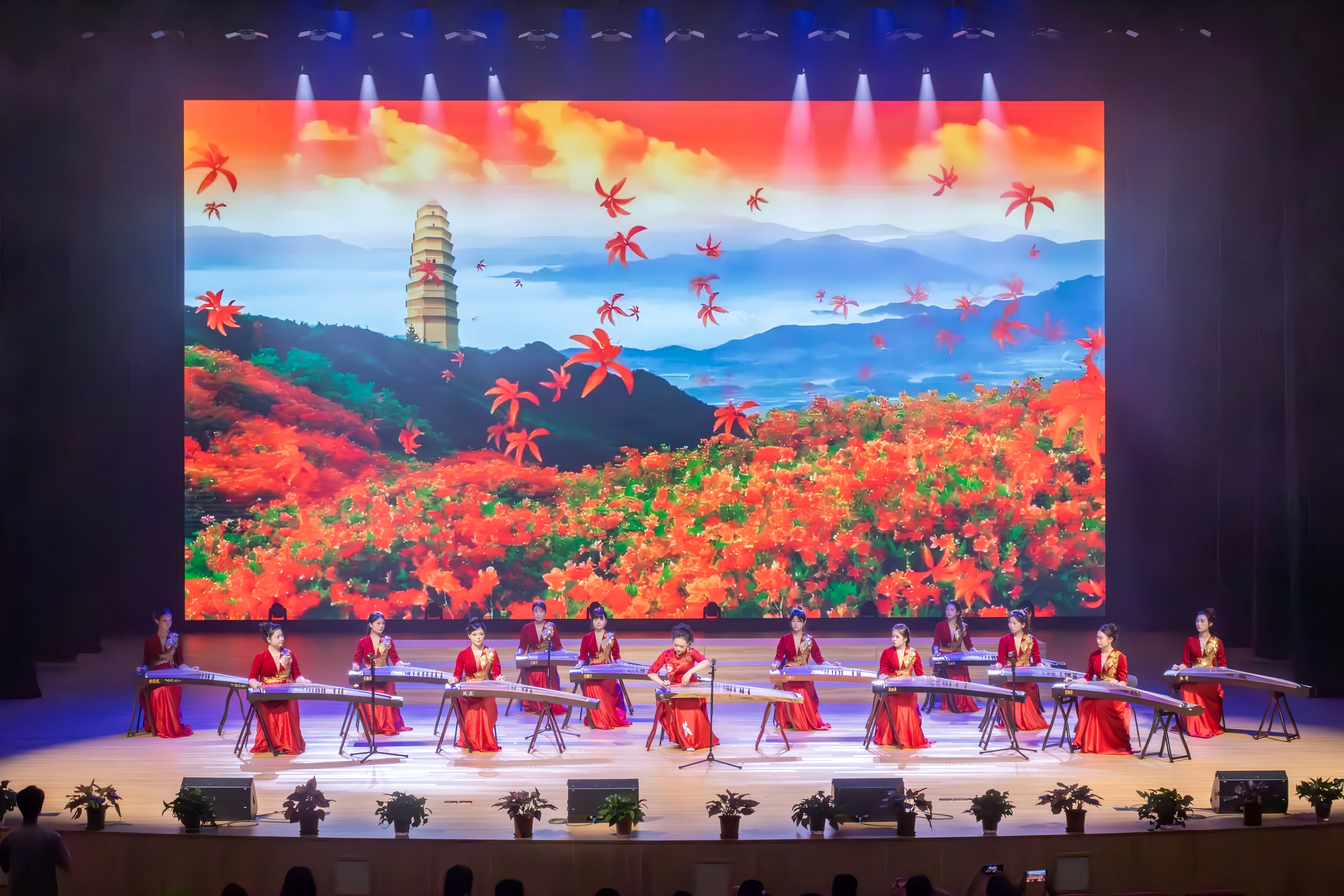 第二章“ 薪 · 砥砺前行 ”的序幕,由一曲热烈奔放的《山丹丹花开红艳艳》正式拉开。杨瑞芳老师带领音乐学院筝乐团登台,数十架古筝同频共振,清亮悠扬的旋律瞬间铺满全场——既还原了陕北民歌“山丹丹开花映山红”的明媚画卷,又以激昂的节奏传递出蓬勃的生命力。杨瑞芳老师的领奏时而灵动跳跃,似山花绽放;时而豪迈高亢,如春风拂面,与团员们的合奏默契无间,用传统民乐的独特魅力,诠释着“ 薪火相传、砥砺向上 ”的篇章内涵,让现场洋溢着炽热的奋进气息。