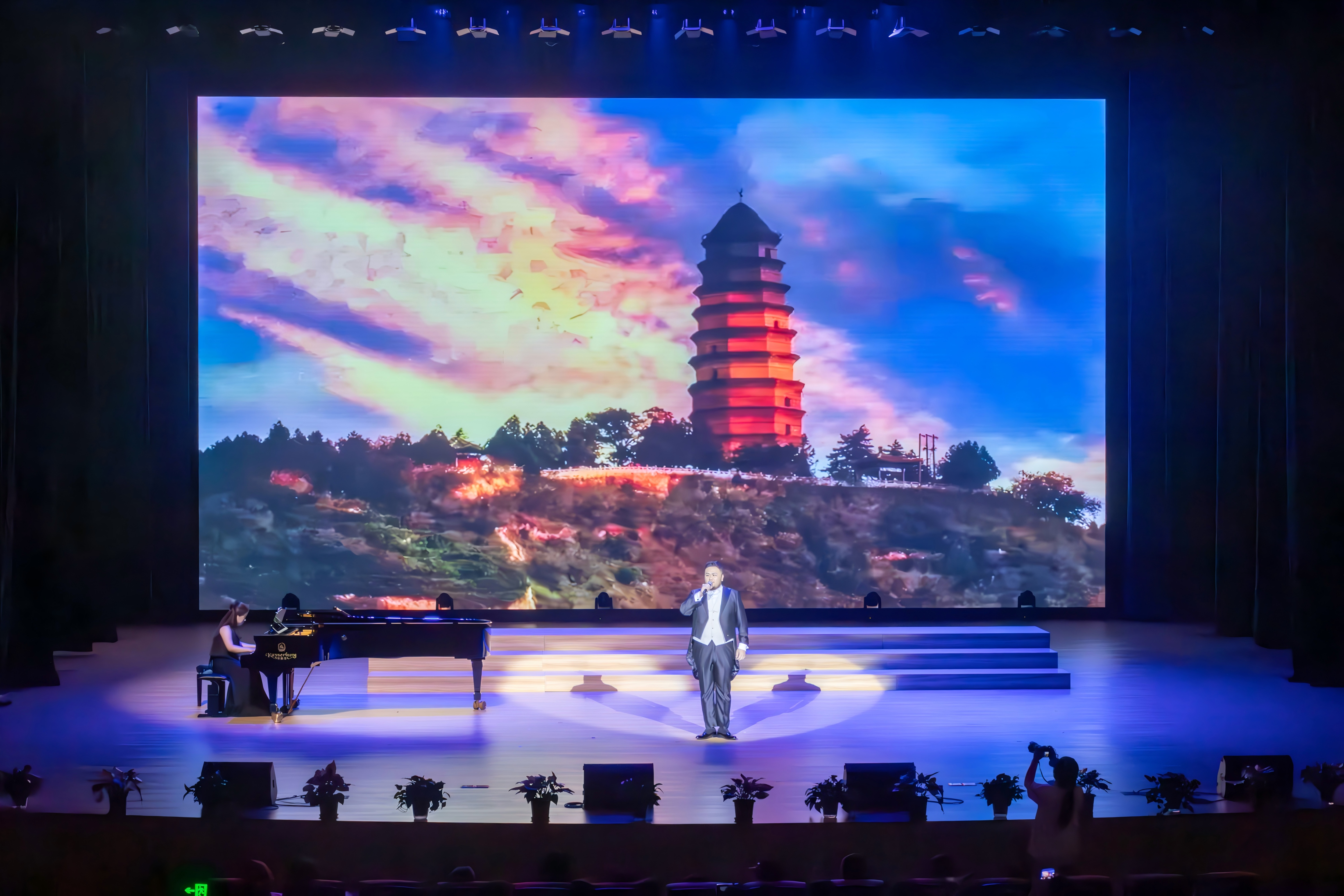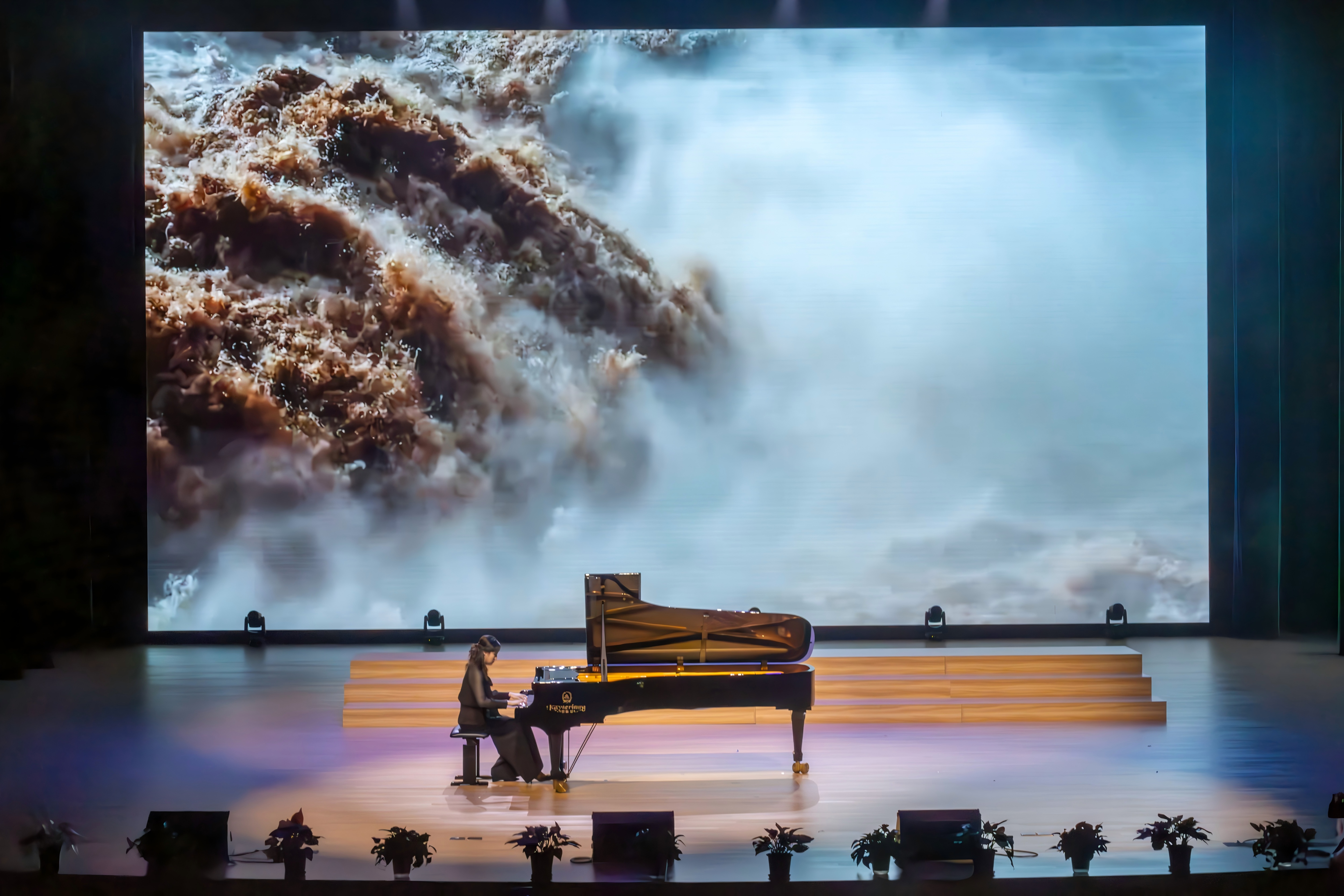 《钢琴协奏曲黄河·第一乐章》的旋律瞬间将观众带入史诗般的壮阔意境。郑玮琳博士以精湛技艺奏响开篇——指尖流淌的急骤琶音如黄河巨浪奔涌而来,模拟出船夫号子的铿锵节奏,生动刻画了船工们与惊涛骇浪搏斗的壮烈场景。随着乐曲推进,她的演奏在激昂与悠扬间自如切换:强劲的柱式和弦展现抗争的坚毅,舒缓的旋律片段又似曙光穿透迷雾,传递出绝境中的希望。指尖翻飞间,西方钢琴的恢弘技法与中国民间音乐的质朴韵味完美交融,将中华民族不屈不挠的精神力量诠释得淋漓尽致,每一个音符都激荡着人心。