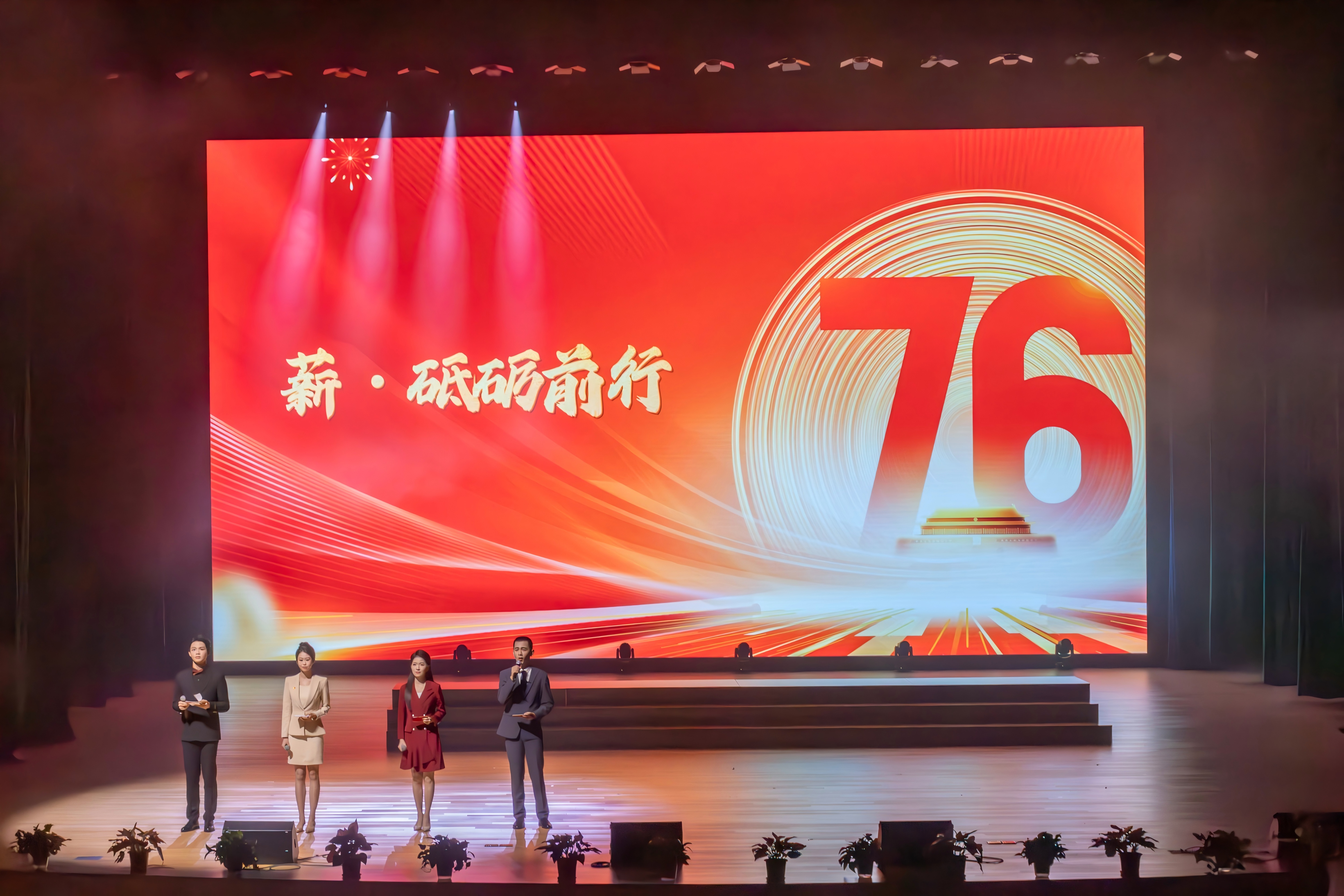 卢晓佳、袁浩闻、周雨晴、孙英倍四位主持人深情讲述追忆革命先辈的热血奉献,时而畅谈新时代青年的使命担当,其中卢晓佳与袁浩闻凭借专业的表达优势,将讲述内容赋予了更生动的画面感,周雨晴、孙英倍则以质朴的情感传递共鸣,让现场观众仿佛置身于一场与家国历史的对话之中,进一步点燃了全场的爱国热情。