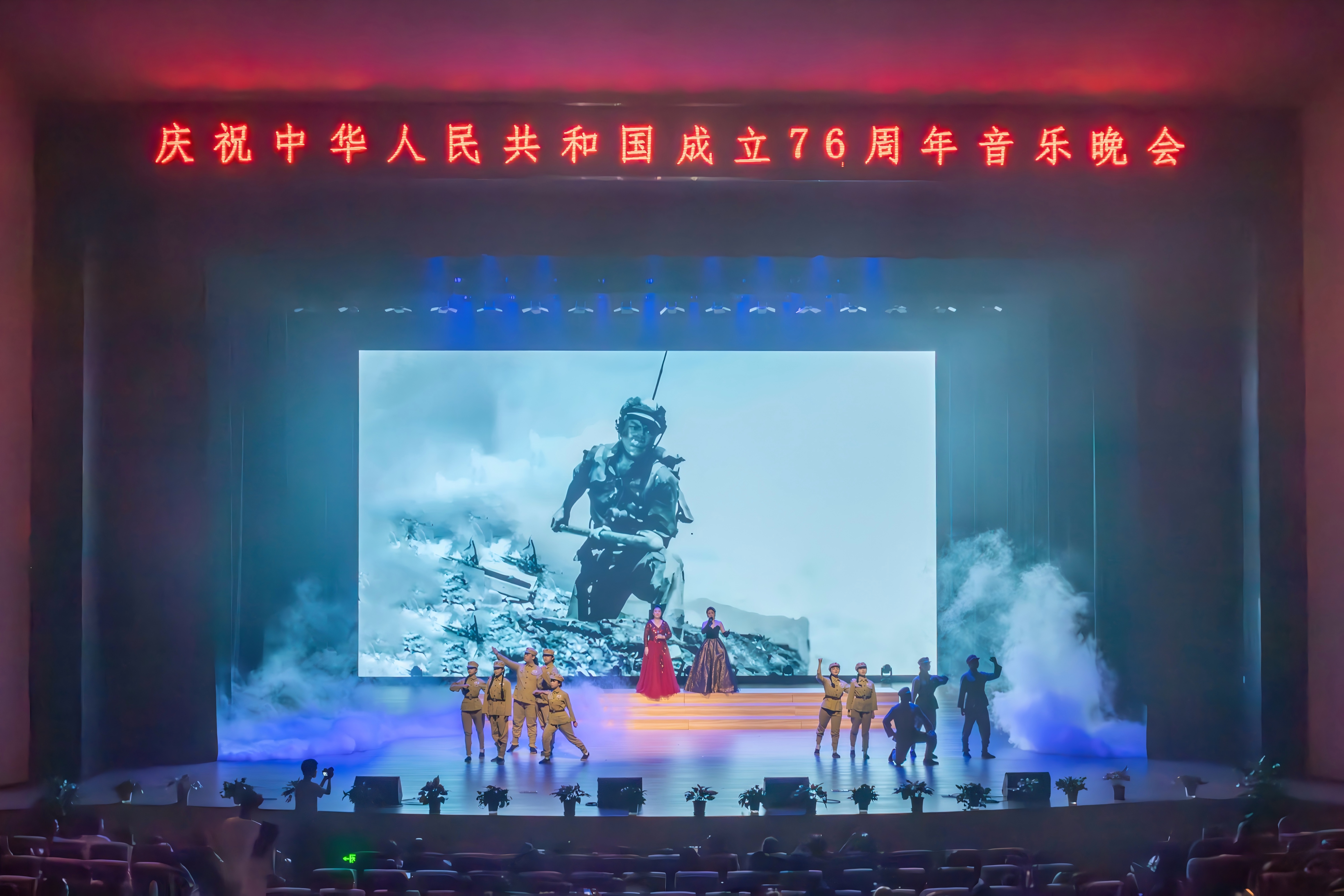 歌曲由声乐教研室主任石紫琪、张婷婷教授亲自领衔,与同学们并肩登台——两位老师的声线醇厚有力,以专业功底诠释着对英雄的崇敬;同学们的合唱则充满激动,用青春之声传递着对先烈的缅怀,师生同心,歌声交织成磅礴的力量。从“烽烟滚滚唱英雄”的激昂开篇,到“为什么战旗美如画”的深情赞颂,每一句都饱含敬意,既呼应了“砥砺前行”中对英雄精神的传承,更让全场在旋律中读懂:英雄的精神,正是我们薪火相传、奋勇向前的不竭动力。