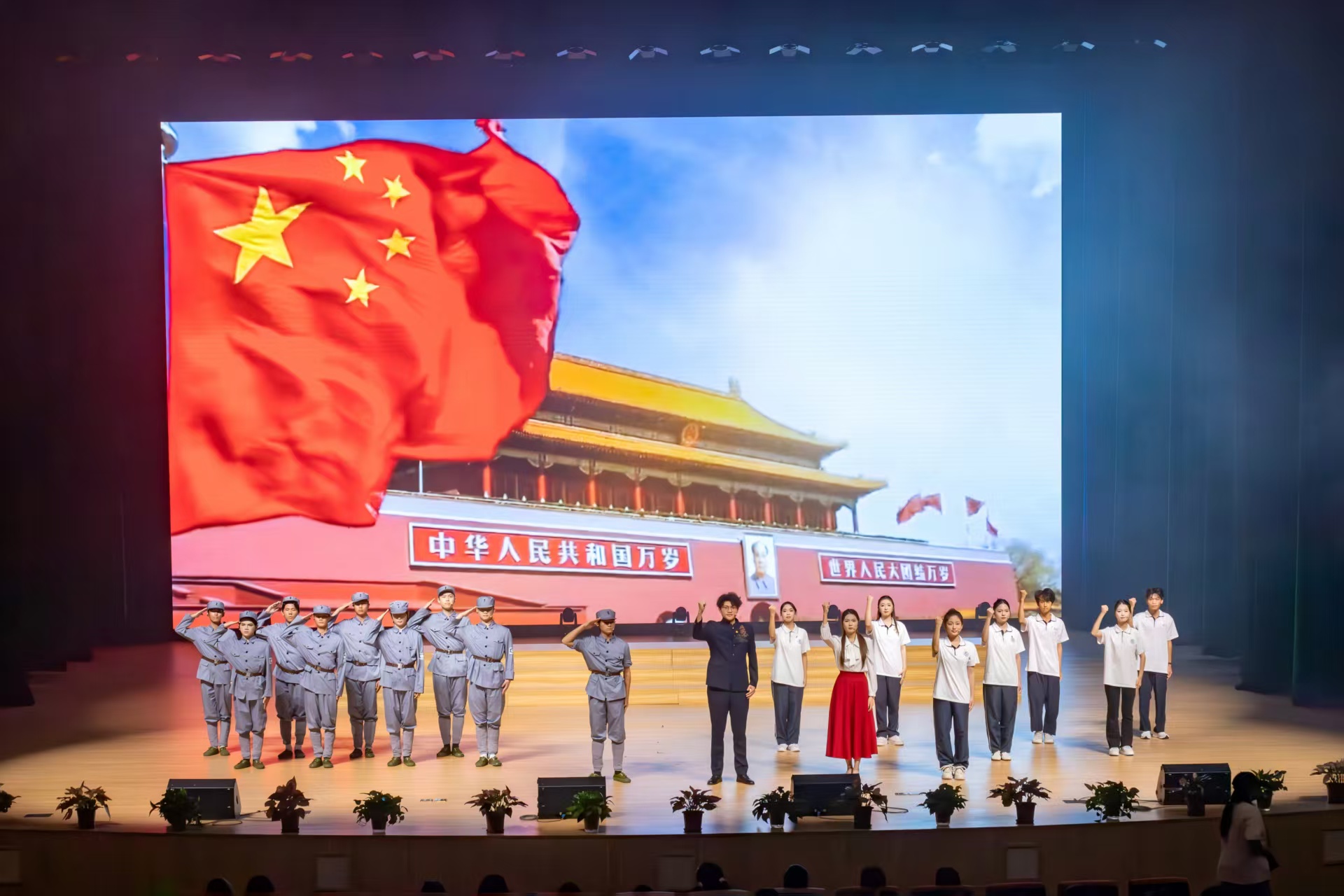 接下来由肖敏老师带领同学们登台,以汪峰版《我爱你中国》的流行曲风,点燃全场热血。当“我爱你中国,亲爱的母亲”这句歌词响起时,肖敏老师的声线温柔而厚重,似对母亲的低语倾诉;同学们的合唱清亮而炽热,如青春对祖国的深情告白,师生歌声交织,将“母亲”二字的亲昵与崇敬唱得淋漓尽致。背景中的星光随旋律轻轻闪烁,仿佛化作千万颗赤诚之心,与歌声共振,既让“对祖国的爱”具象为对“母亲”的依恋,又以“星光聚成心”的画面,呼应“ 薪 · 砥砺前行 ”中代代相传的家国深情,引得台下观众眼中泛起暖意,纷纷轻声跟唱。