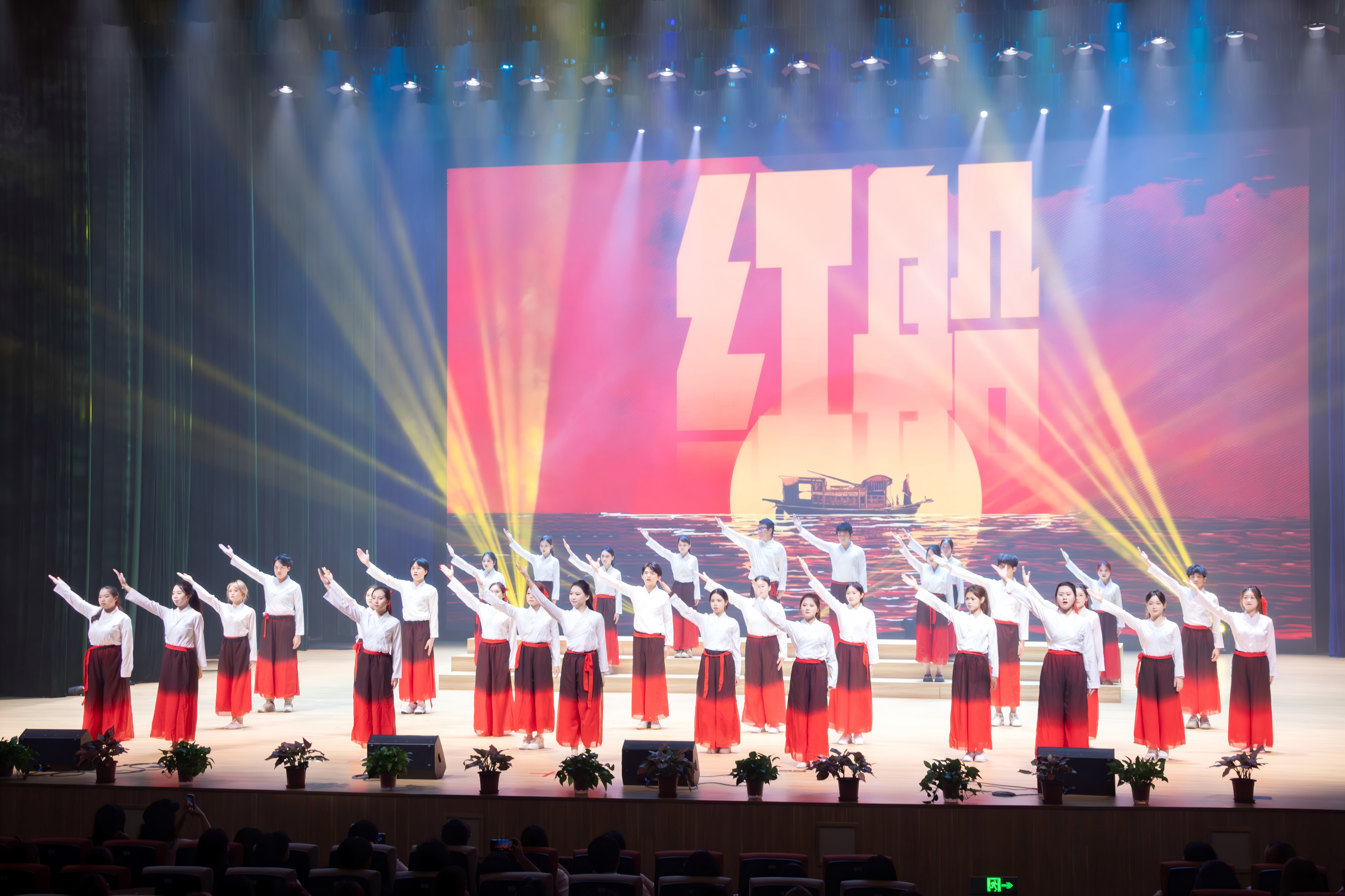 音乐晚会精心设计“启·星火燎原”、“薪·砥砺前行”、“赋·同心筑梦”三大篇章。随着悠扬的前奏响起,音乐晚会的第一篇章:“启·星火燎原”正式拉开帷幕 —— 音乐学院合唱团率先登场,以经典红歌《没有共产党就没有新中国》开启演出篇章。在黄俊凯老师富有感染力的指挥和陆定坤老师激情的伴奏下,同学们眼神坚定、歌声嘹亮,将对党的崇敬与热爱融入每一句演唱中,激昂的旋律与真挚的情感交织,不仅引发了全场观众的情感共鸣,更让现场的爱国氛围愈发浓厚。