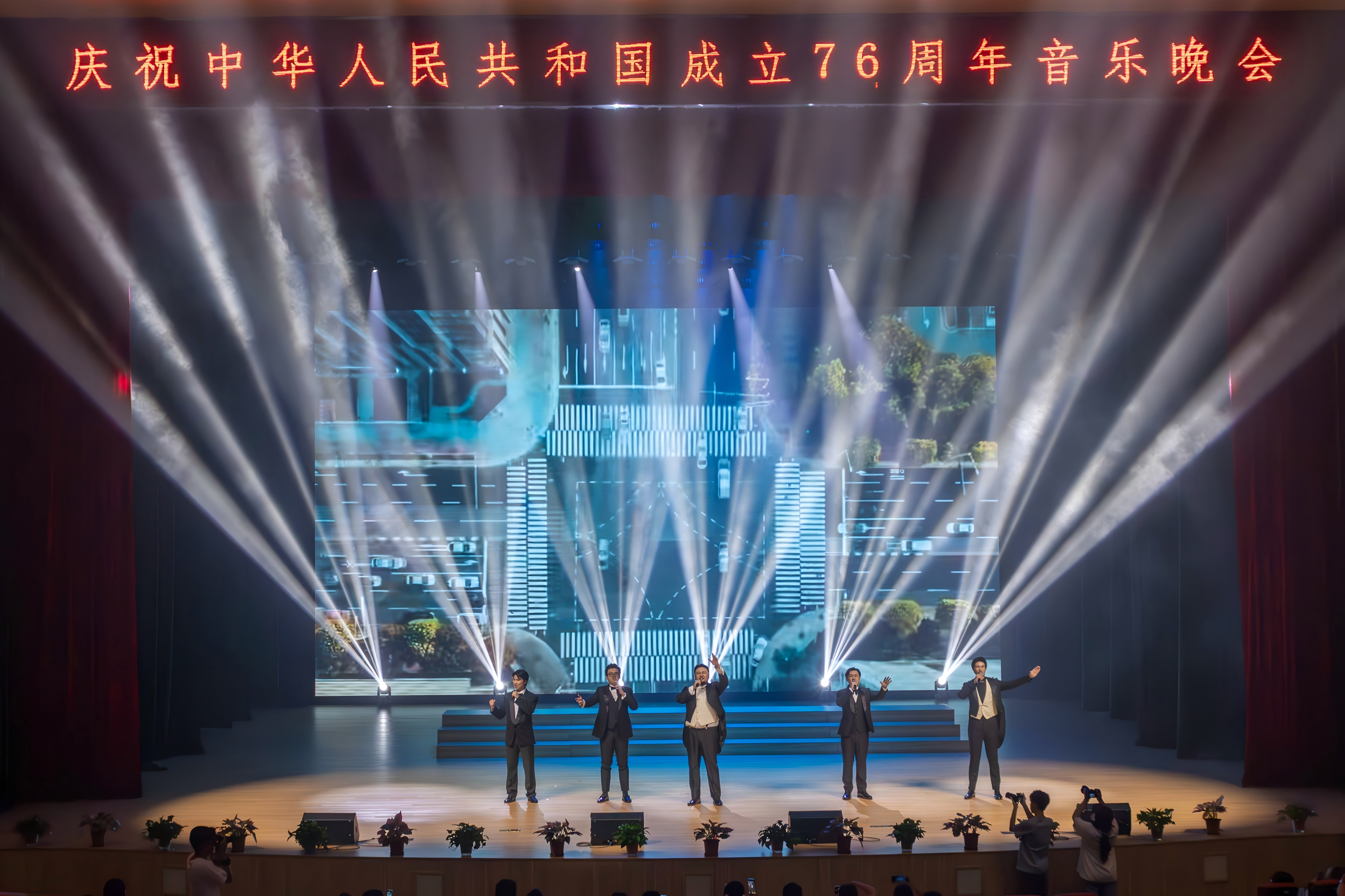 舞台灯光转为明亮的暖色调,蔡浩贤、周恩、赵禹、叶鸿、张洲翰五位帅气的青年教师演唱,表现新时代的创作歌曲《新路》。他们的演唱没有华丽的修饰,却以默契的和声、饱满的情感,将“开辟新路”的故事娓娓道来:合唱时声音磅礴,似众人同心闯险滩。歌声里,“新路”既是脚下的征程,更是“ 同心筑梦 ”的方向,五人用极具感染力的演绎,将“一群人、一条心、一条路”的画面感拉满,既凸显了男声雄浑用力的声音魅力,又让“ 赋 · 同心筑梦 ”的主题在“闯新路、共奋进”的旋律中愈发鲜明,引得台下掌声阵阵。