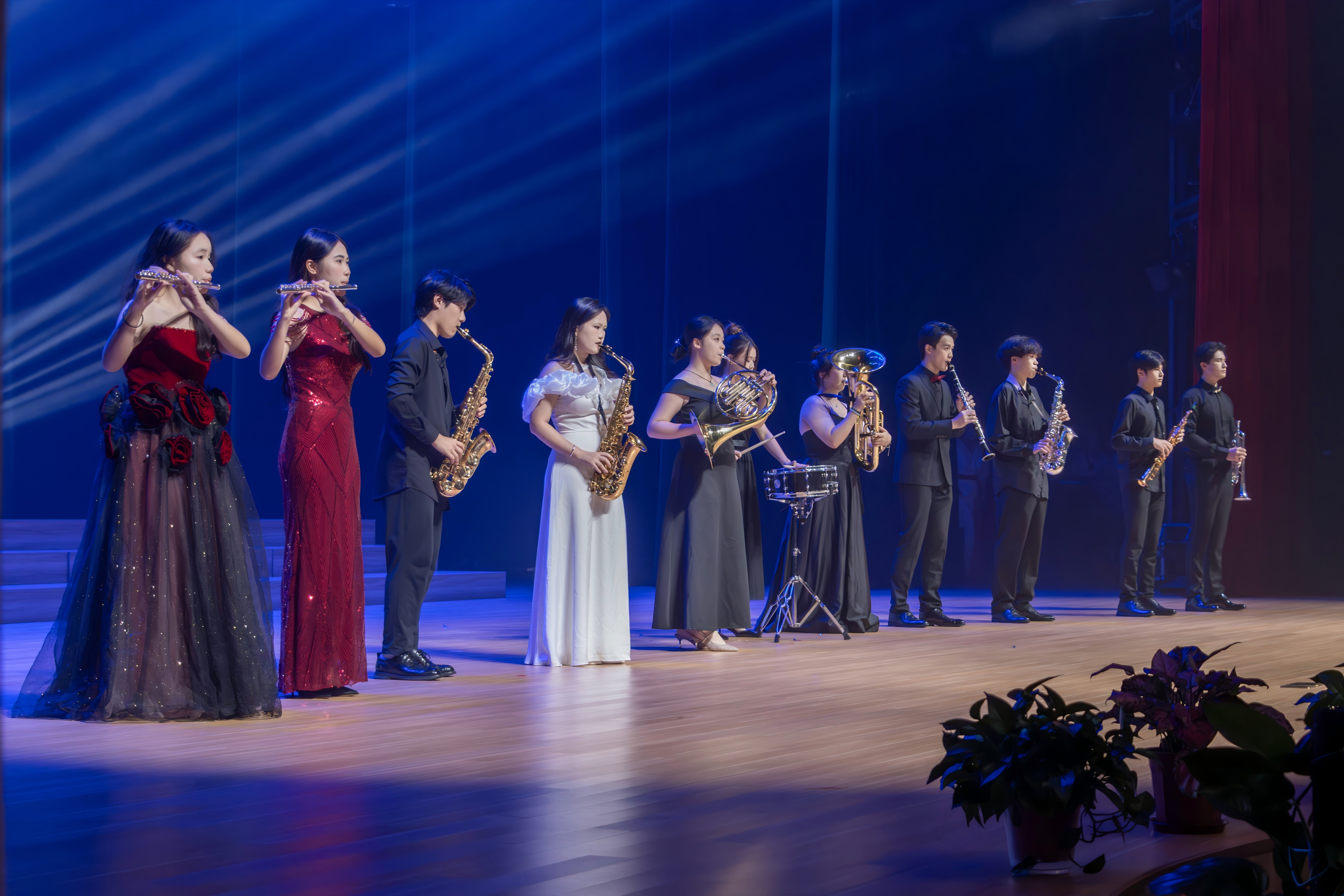 《新路》的昂扬旋律刚落,第三章“ 赋 · 同心筑梦 ”的高潮便随之而至——音乐学院管乐团,在戴奇晟、龙赛男、张洲翰三位指导老师的联袂指导下,奏响“ 93阅兵同款 ”的《钢铁洪流进行曲》。小号的嘹亮划破长空,圆号的厚重奠定基调,长号、长笛与打击乐交织共鸣,完美还原了乐曲“钢铁洪流、气吞山河”的阅兵气势:前奏响起时,似方阵迈着铿锵步伐走来;旋律推进间,如战车轰鸣、旌旗猎猎,管乐的恢弘质感将“钢铁洪流”的磅礴与力量展现得淋漓尽致。作为李旭昊的经典之作,乐团的演奏既复刻了阅兵现场的震撼,又以“ 同心协作 ”的管乐合奏,呼应“ 同心筑梦 ”中“ 凝聚如钢、共筑强国 ”的核心,让全场仿佛置身阅兵现场,热血沸腾。