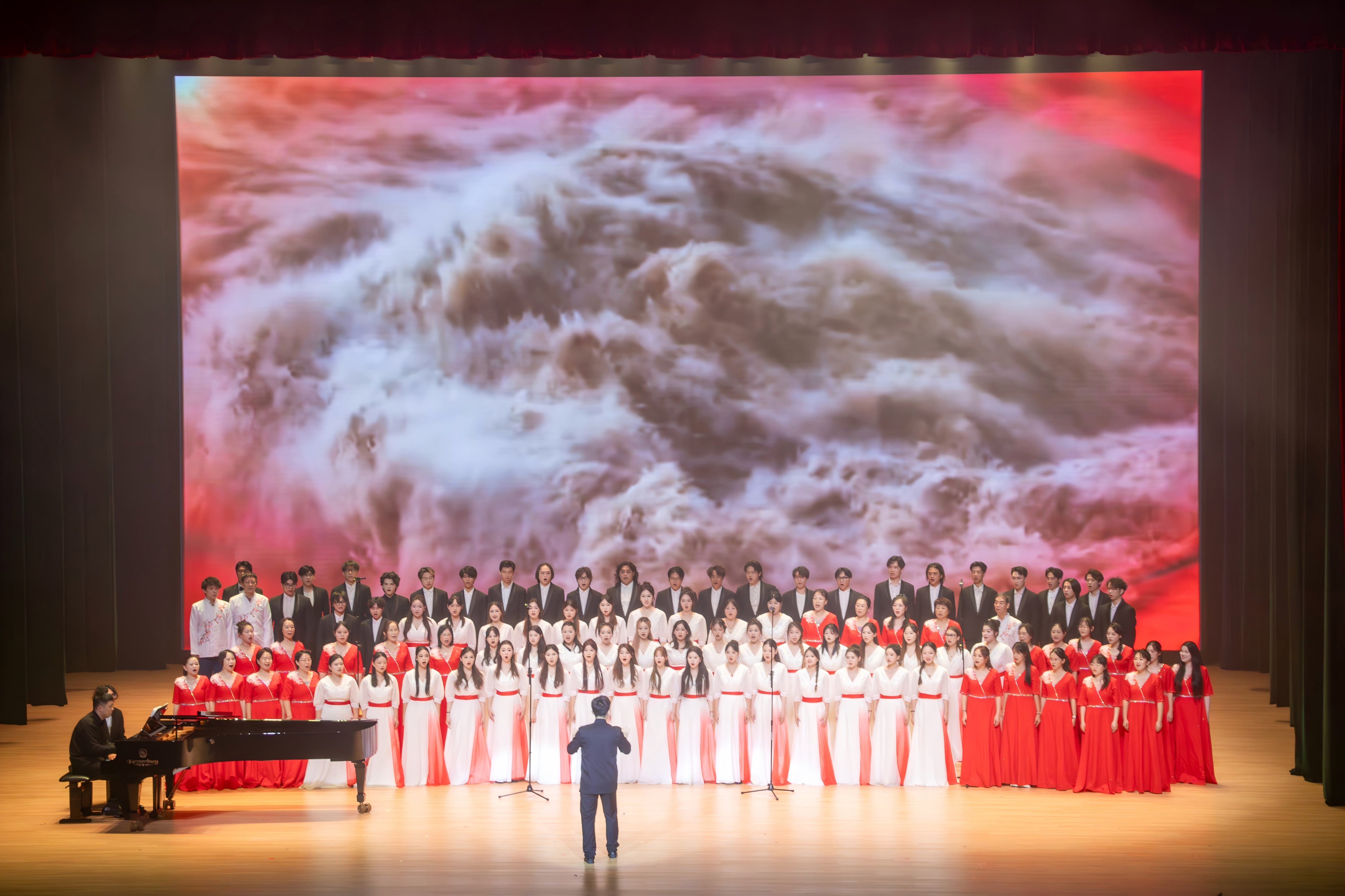 随着《保卫黄河》的最后一个重音落下,旋律无缝切换至这首由著名歌唱家郭兰英领唱的经典之作《我的祖国》,卢芷莹、宣守慧两位老师演绎,立刻将全场师生们带到了美好祖国的山水之中。她们的声线清亮而深情,从“一条大河波浪宽”的悠扬婉转,到“风吹稻花香两岸”的温柔眷恋,瞬间将氛围从历史的激昂转为对故土的深情。陆定坤老师的钢琴伴奏如流水潺潺,黄俊凯老师的指挥手势也从刚劲转为舒展,三大合唱团声音雄壮、和声饱满、激情澎湃,将“这是英雄的祖国”的自豪感演唱得淋漓尽致。