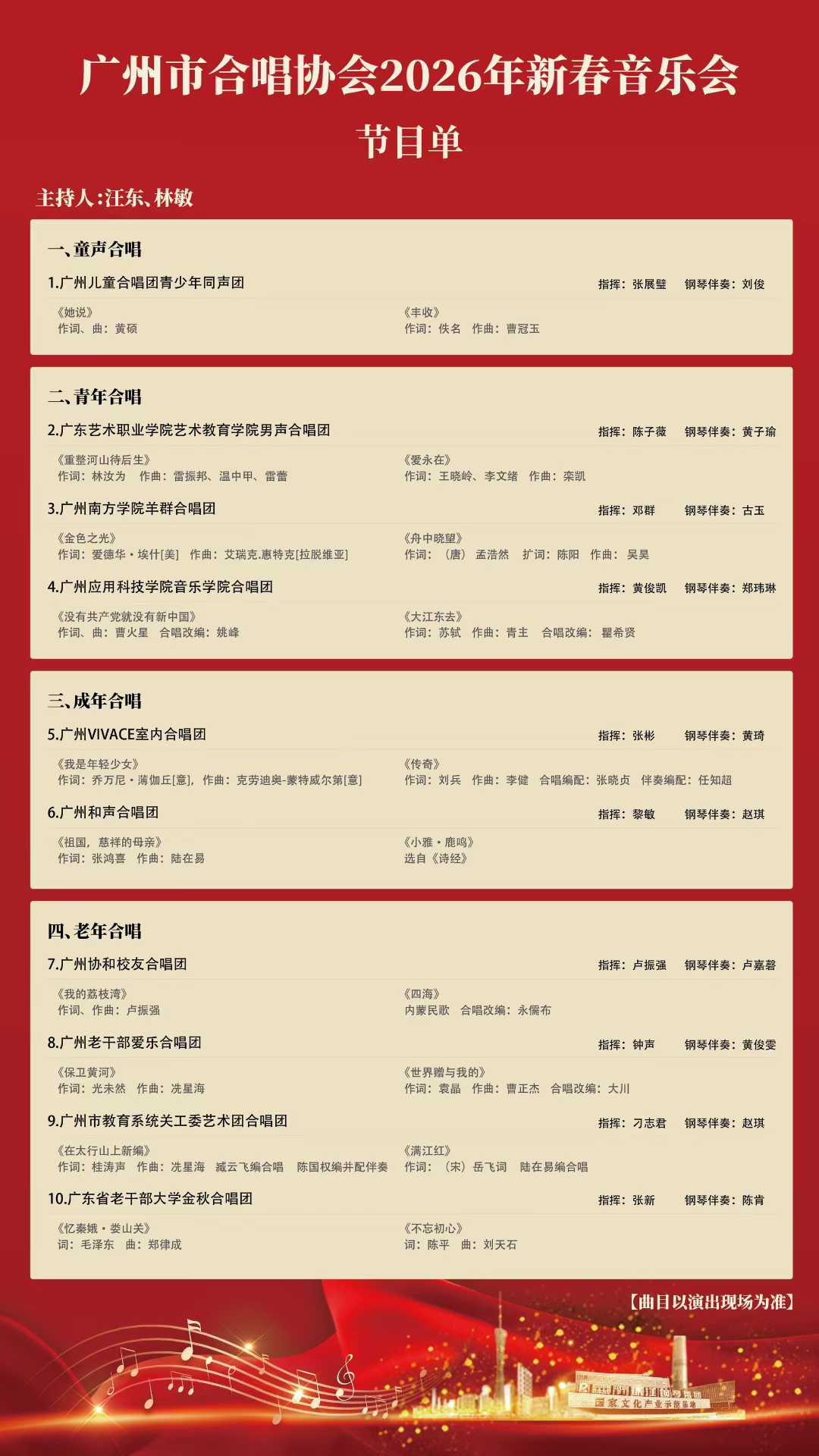 本次音乐会是广州合唱领域的一场高规格艺术盛会,舞台呈现与专业配置均体现行业高水平。演出阵容涵盖童声、青年、成年、老年等各年龄段合唱团体,汇聚了来自专业院校、职业团队及老年大学等多类艺术群体,生动展现了合唱艺术的广泛包容性与感染力。
