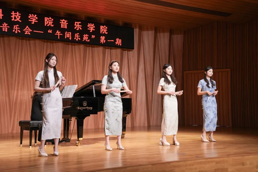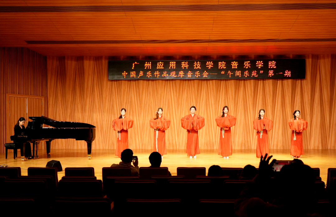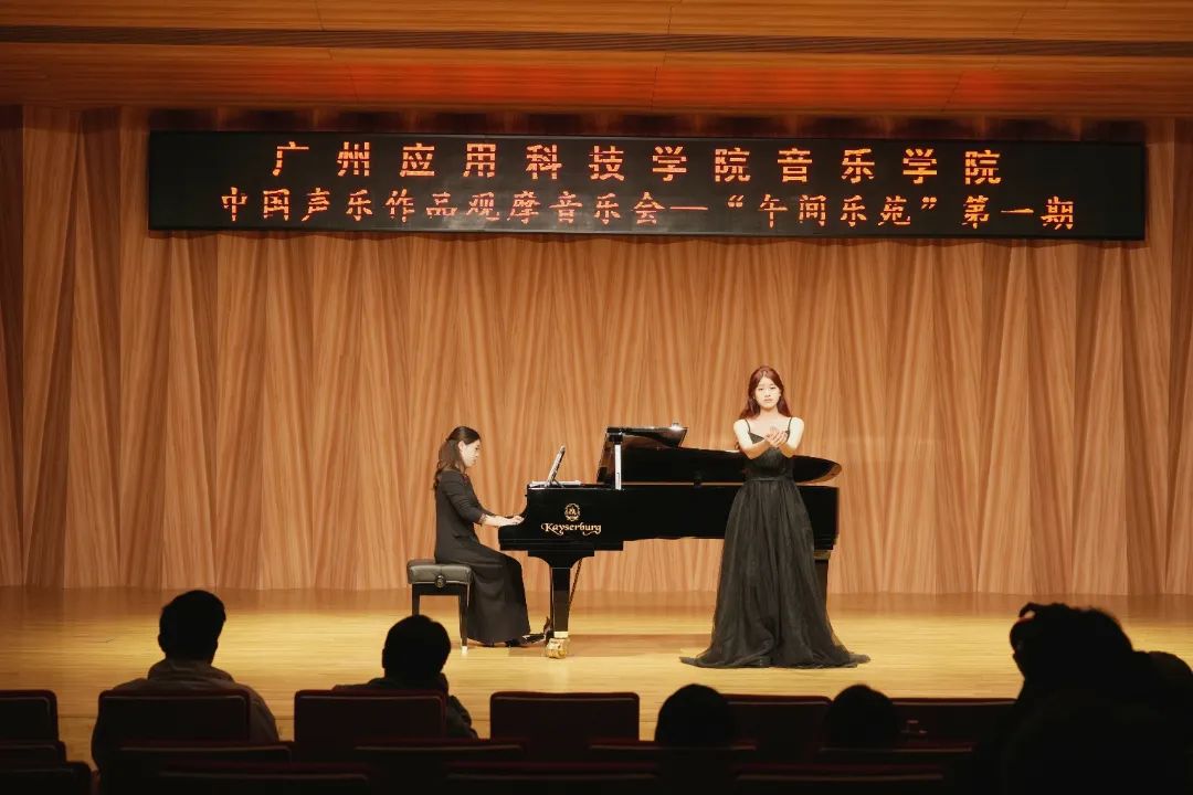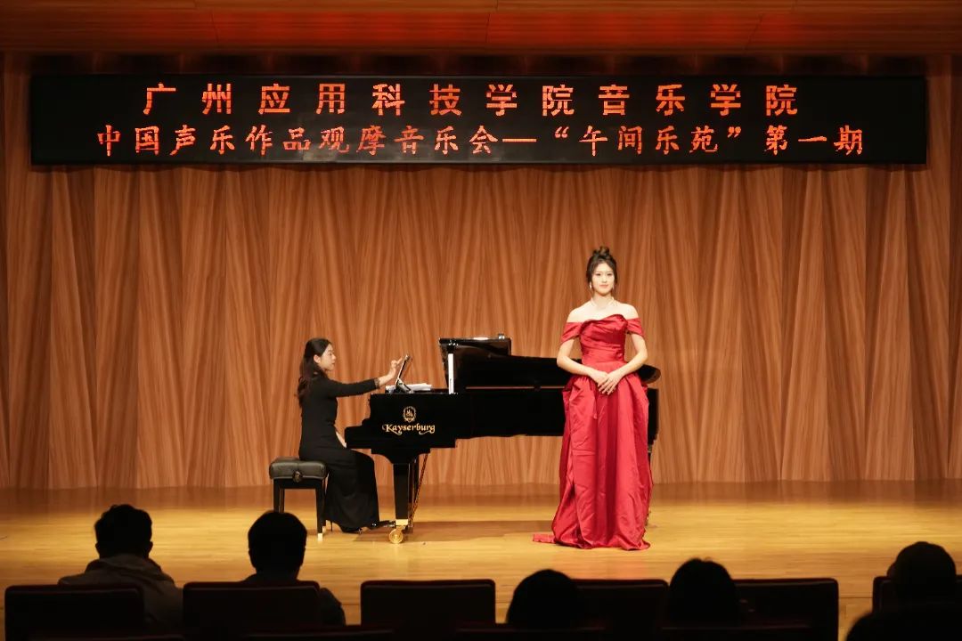 旋律描绘中国艺术地图,歌声唱响时代崭新气象。为贯彻落实教育部《关于全面实施学校美育浸润行动的通知》等美育工作文件要求,营造昂扬向上、文明高雅、充满活力的校园文化艺术氛围,提升学生的艺术素养和审美能力,促进声乐教学实践与理论的深度融合,4月1日下午,广州应用科技学院在音乐厅举办“午间乐苑”系列实践活动的首场演出——中国声乐作品观摩音乐会。“午间乐苑”系列实践活动由音乐学院主办,首期演出由声乐教研室精心策划并承办。